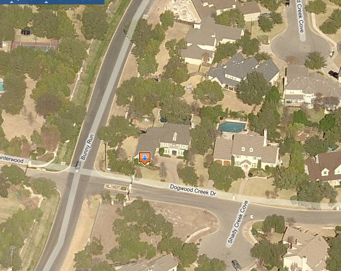 A shot of Alex Jones’ Dogwood Creek Drive home in Austin, Texas.. Looks like he has a nice pool in his back yard. The pool is covered by trees, but you can see the outline of it.. This is a gated community. Apparently, Stratfor takes good care of Jones