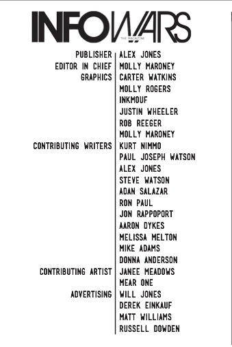 The Infowars Magazine editorial team slug with Maroney as it appeared during her tenure as managing editor and graphics contributor. She left Infowars in August 2013, at least officially. John McEntire replaced her as editor.