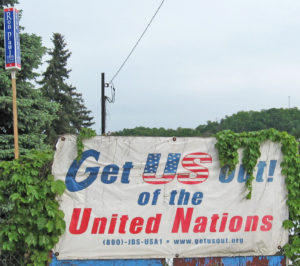 After establishing himself on radio and with his website, Jones consistently spread New World Order conspiracy theories centered around a unified plot carried out by the United Nations, the Council on Foreign Relations, and the U.S. Federal Reserve. This line is straight from the rhetoric put out by the JBS. One notable instance of Jones parroting the JBS line was during a public speech given by then-Texas governor George W. Bush.[4] Jones interrupted the soon-to-be U.S. President and accused him of being in league with the Federal Reserve and the CFR. In what could well have been a staged incident, authorities then handcuffed Jones before the cameras stopped rolling. Of course, he was eventually let go, presumably without incident. On his radio program, Jones constantly ranted and raved about the United Nations takeover of America, a specifically JBS theme. The JBS states that one of its “most immediate objectives…is to get the United States out of the United Nations and the United Nations out of the United States.” It even produced a documentary, The UN Deception, in 2001[5]. An old video from the 1990s surfaced on Youtube within the last few years showing Alex Jones fingering the UN as being part of a plot to oppress Jews in Israel.[6]