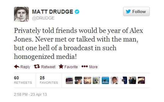 drudge goes on about how the internet is going to hell because of twitter etc. the trouble is he is losing market share and viewers and he doesn’t like it or know what to do about it. his viewership is shrinking. his day is over. he reaches out to jones in hopes of picking up some readers i guess. why else would he show up around jonestown? that other jew, savage did the same thing. its a pretty sad day when someone has to go make nice with jones in order to try and get listeners or readers etc. on a side note, just how much more gas in the tank does jones have? 20 years in the saddle, fighting the new world order (yeh sure) his flock of air heads that follow his show refuse to discuss the entire fiasco about the latest money bomb. absolutely no interest. they all think he is the greatest thing since sliced bread. oh well.