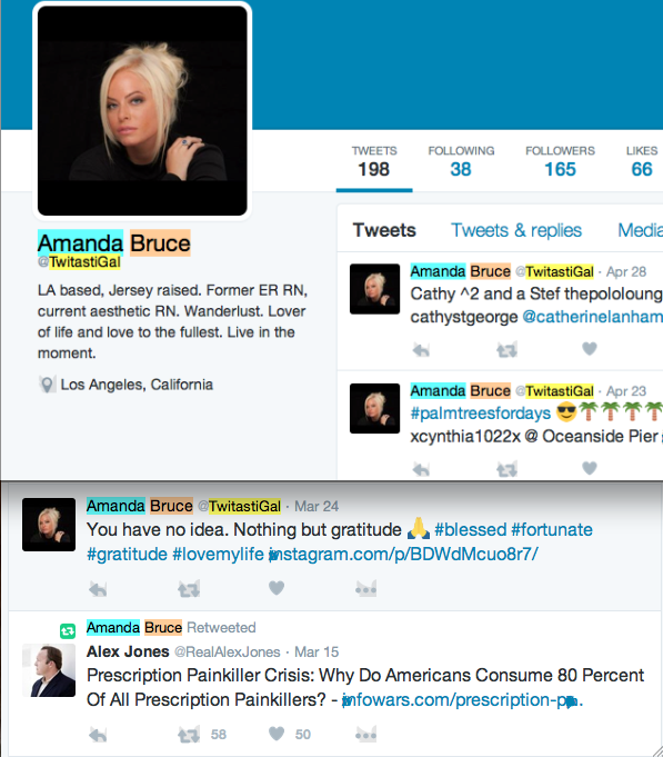 Bruce claims she is a registered nurse. While this may be true, it appears she has a questionable past—a past that corroborates Sheen’s fixation for hookers and porn stars. The world’s largest gossip site The Dirty suggests that Bruce is or was an L.A. escort in kahoots with Freddy Figueroa, aka Freddy Figs. What? Alex Jones, hookers, Sheen, cocaine?