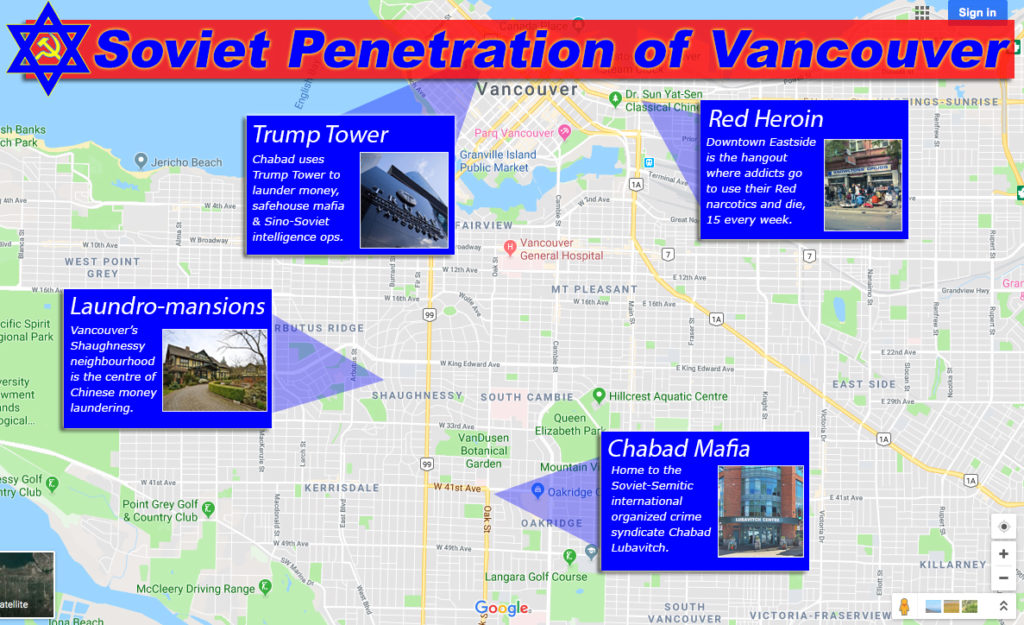 The root of the problem is the Soviet narcotics offensive, with much of Vancouver’s drugs coming from Communist China’s Golden Triangle region, and Sino-Soviet money laundering, which involves the KGB (now FSB), Chinese intelligence, and the Sino-Soviet-Semitic international organized crime syndicate, including Chabad Lubavitch.