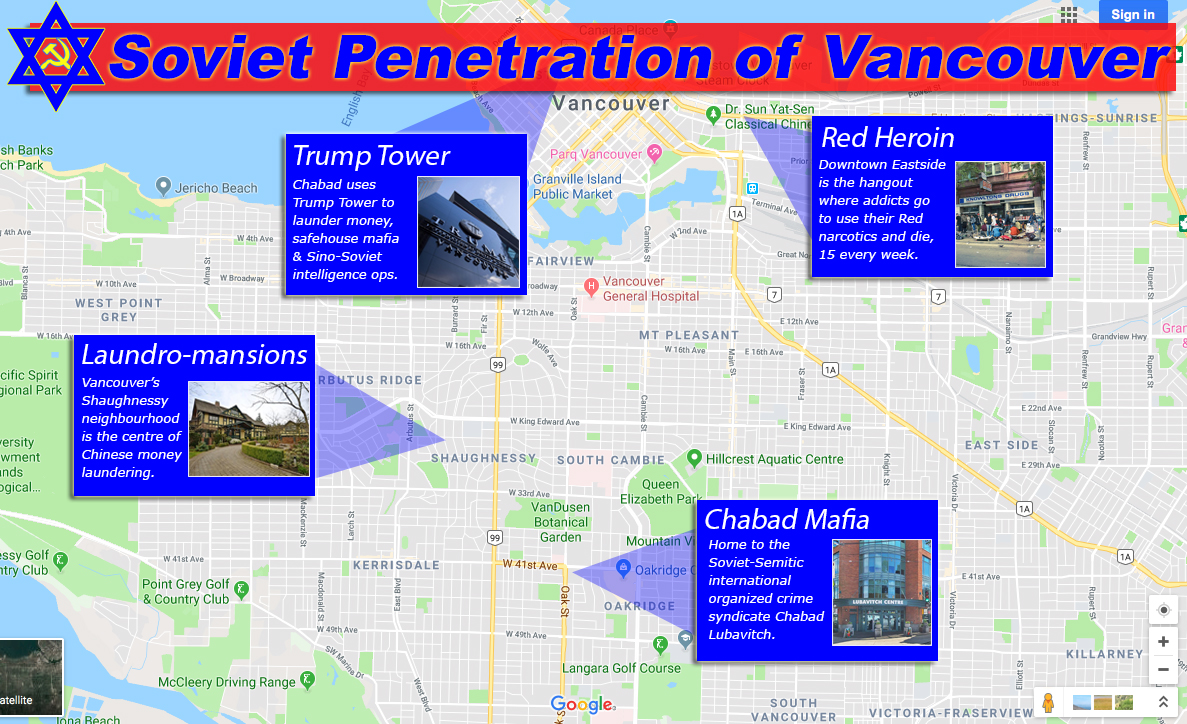 Shaughnessy, which is located very close to the Chabad district of Vancouver, is a microcosm of the macrocosmic Soviet active measure throughout all of Vancouver, Silicon Valley, and in other places in the West. So, too, is Vancouver’s Trump Tower (Toronto, where the same housing bubble exists, also has a mobbed-up Trump Tower). Real estate seems to be the primary instrument through which gangsters and gangster-run governments, like in Marxist Russia, China, and Israel, launder their money.