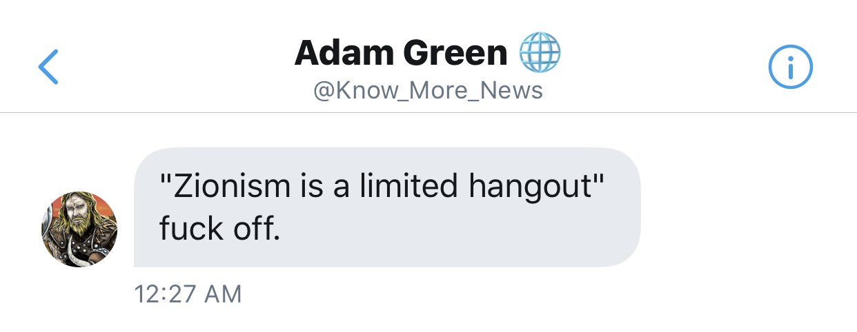 Unfortunately, for the Judbols and their Infowars operation, it didn’t take long for even simpleton researchers to figure out Green, whether it was the obnoxious Chris Dorsey or Green’s early rival gatekeeper Brendon O’Connell, who correctly identified Green as a “spinoff” of Jones. Infowars has overplayed its hand by giving Green a platform as an Infowars dissident, once with Owen Shroyer, and a second time with the king gatekeeper himself, Alex Jones. Watching the staged opposition between Jones and Green is not only unbelievable but also uninformative. Green can never land a punch on any subject—other than to cry about “Zionists!” all day long—and Jones uses each missed hook to legitimize himself as the poor, censored truth teller, while Green’s groupies receive the dialectic as a victory for their one-dimensional anti-Zionist activism. It’s all so ridiculous.