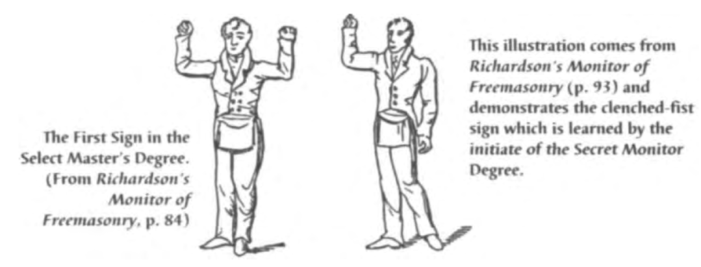 The clenched fist salute, or hand sign, is well-known in Freemasonry. The First Sign, or Due-guard, in the ritual of the Select Master Degree is the holding up, or raising, of both arms in an “L” (square) position with the fists of both hands clenched. The lecture for this degree in Richardson’s Monitor of Freemasonry states: