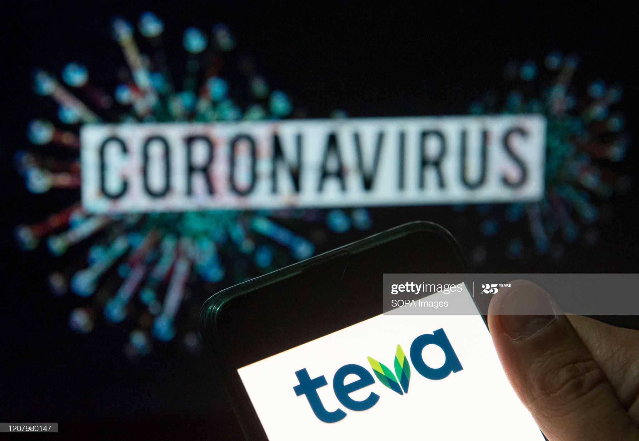 CHINA—In this photo illustration the multinational pharmaceutical company Teva Pharmaceutical Industries logo seen displayed on a smartphone with a computer model of the COVID-19 coronavirus on the background. (Photo Illustration by Budrul Chukrut/SOPA Images/LightRocket via Getty Images)