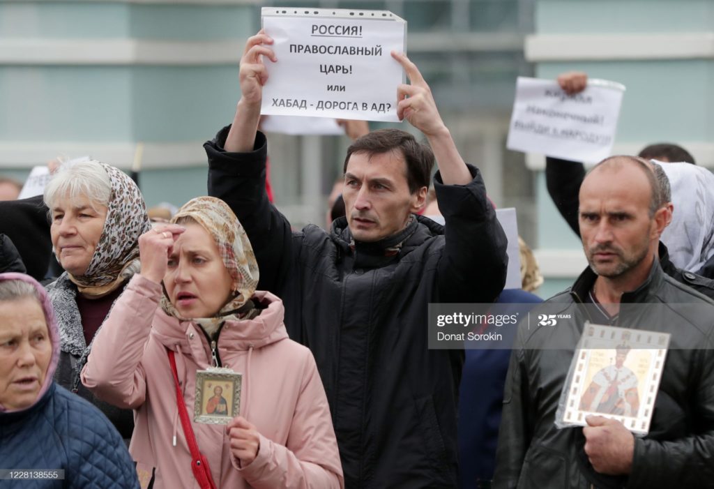 YEKATERINBURG, RUSSIA – AUGUST 21, 2020: Supporters of schema-hegumen Sergiy (Romanov) gather outside the Yekaterinburg Diocese. A sign reads “Russia, Orthodox Tsar or Chabad – Road to Hell?” The Russian Orthodox Church degraded schema-hegumen Romanov of the Sredneuralsky Convent from the priesthood for calling on believers to disobey public health orders regarding “COVID-19”. —Donat SorokinTASS via Getty Images
