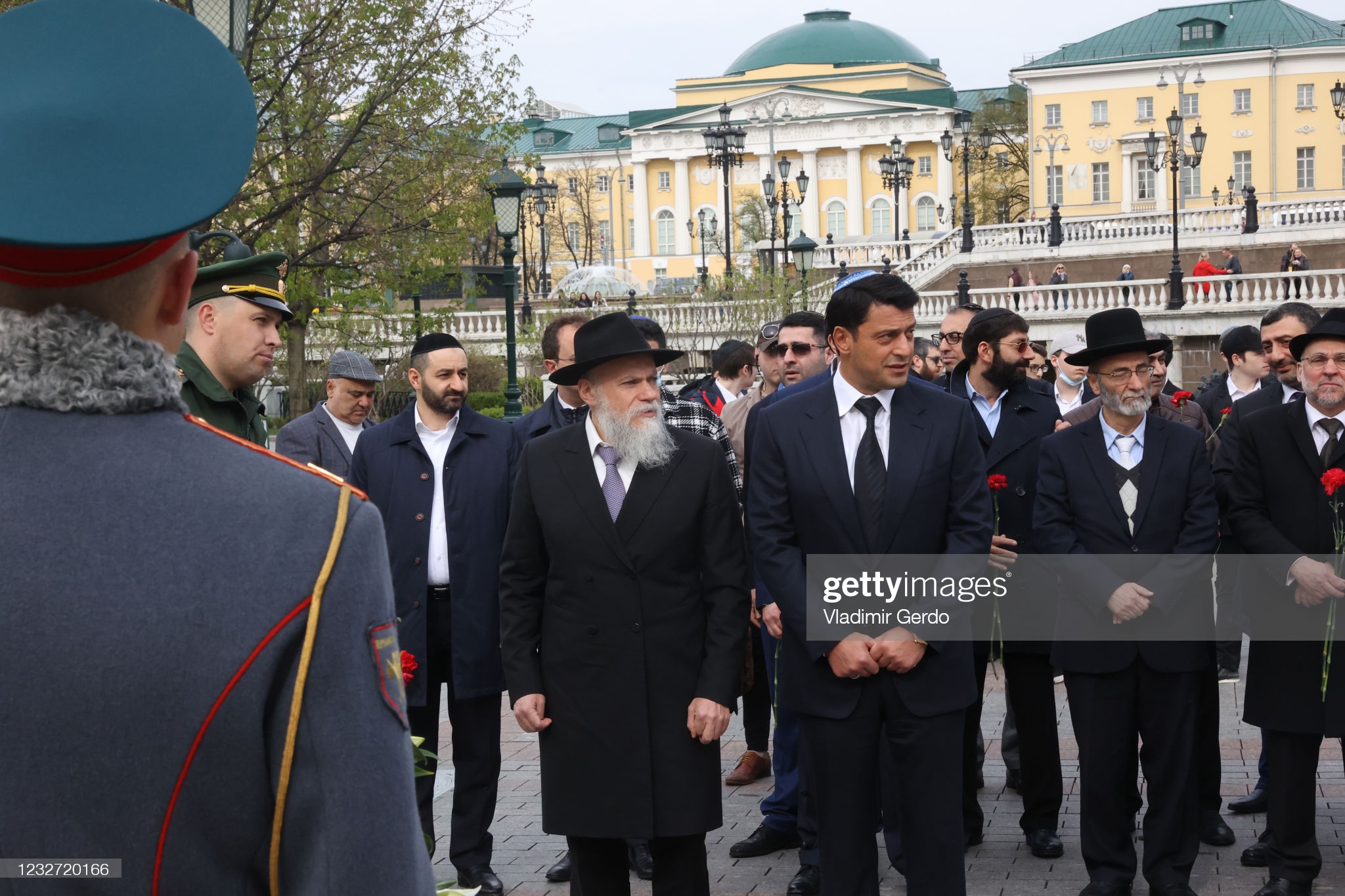 MOSCOW, RUSSIA – MAY 6, 2021: Jewish Communities Federation President Alexander Boroda and STMEGI (International Charitable Foundation of Mountain Jews) President German Zakharyayev (L-R centre) take part in a ceremony to lay wreaths at the Tomb of the Unknown Soldier at Alexander Garden and mark the national and religious holiday of 26 Iyar also known as the Day of Salvation and Liberation of European Jews in World War II. (Photo by Vladimir GerdoTASS via Getty Images)