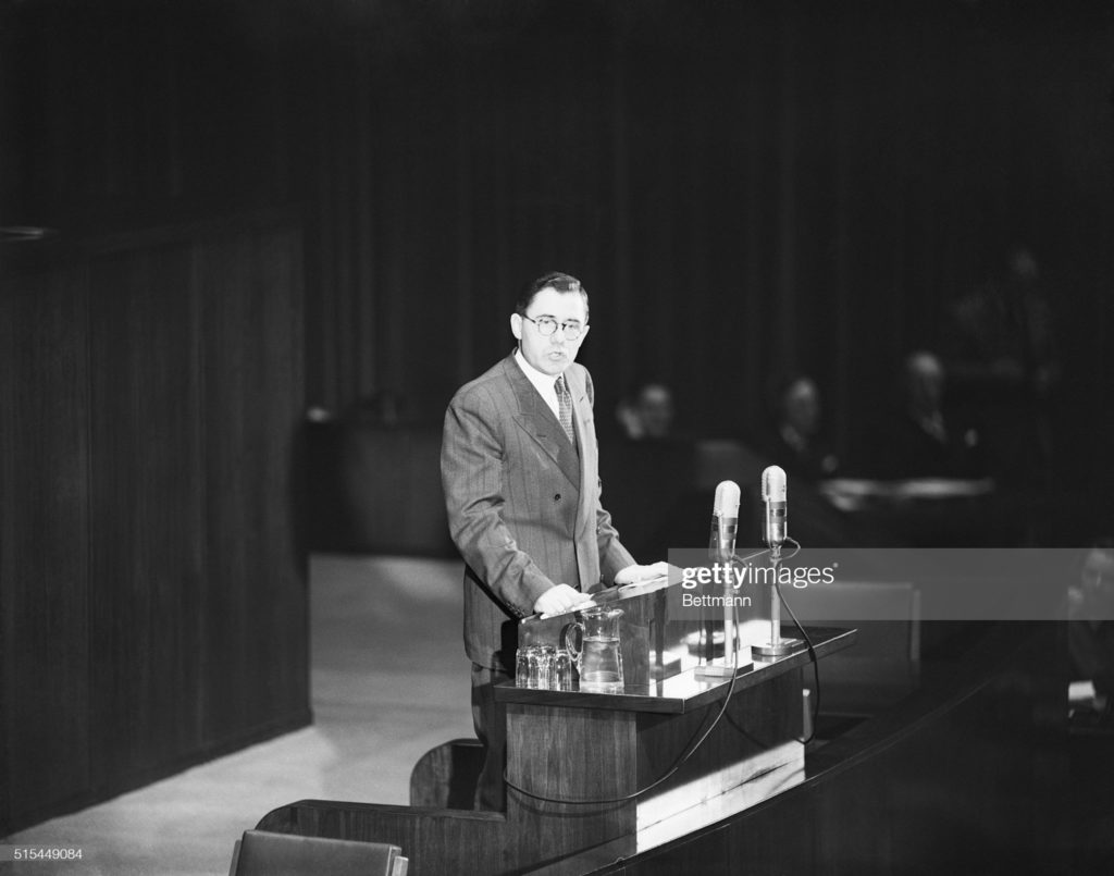 New York—Andrei Gromyko, Soviet representative to the United Nations, is shown as he spoke in favour of an immediate vote on the Palestine partition plan at the history-making session of the U.N. General Assembly at Flushing Meadows, Nov. 29, 1947. Despite opposition by several other delegates, the assembly voted approval by a two-thirds majority of the plan to partition Palestine into independent Arab and Jewish states, which eventuated in the creation of the state of Israel a year later.