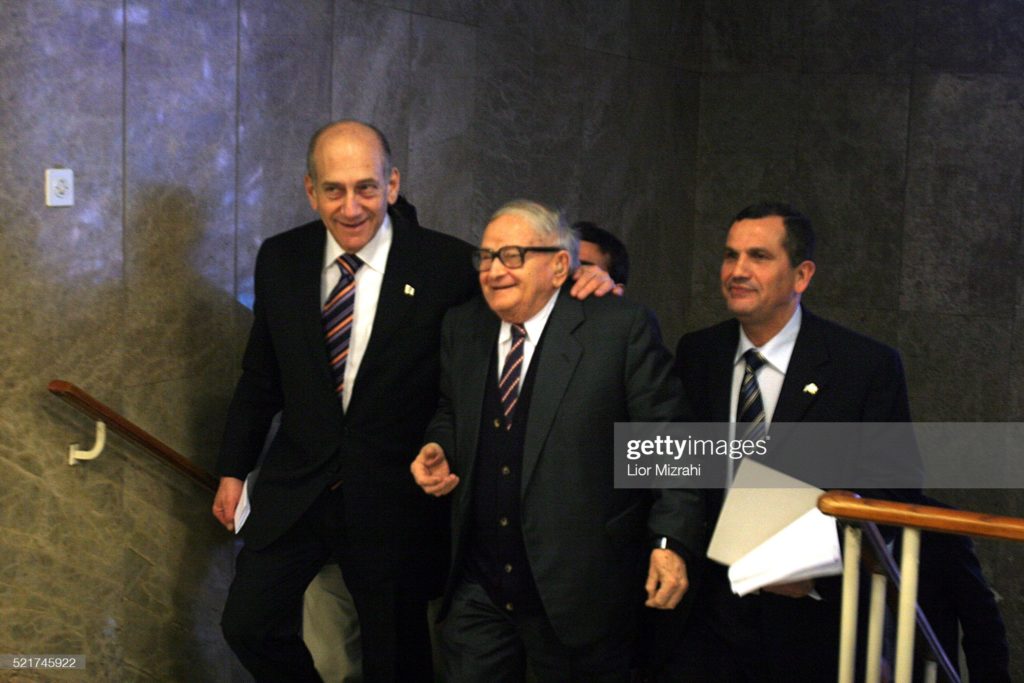 Israeli Prime Minister Ehud Olmert, left, and Pensioners Minister Rafi Eitan arrive to the weekly cabinet meeting in Jerusalem, Sunday, February 11, 2006. Olmert on Sunday said that Israel is yet to form its stance on the Mecca Accord on a Palestinian unity government signed between the rival Fatah and Hamas factions last week. (Photo by Lior Mizrahi/Getty Images)