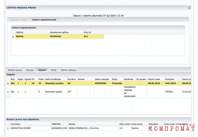According to the extract from the register of real estate in Montenegro, available to the editorial office, Evgeniy Kosmatykh owns apartments in the resort town of Petrovac on the seashore.