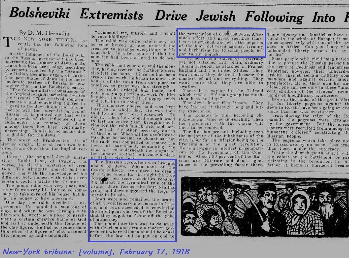 Jew DOVID HERMALIN, admitted in an article in New York Tribune in 1918, that Jews were fully responsible for the Bolshevik Revolution.