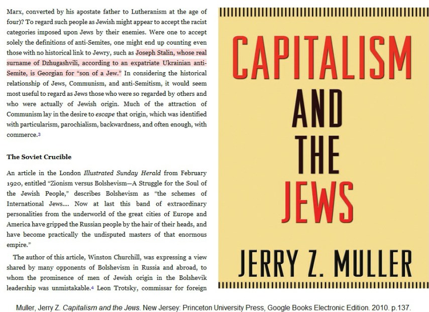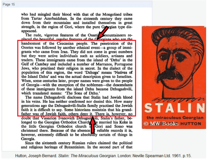 It is claimed that Dzhugashvili means “son of a Jew” in Georgian. It’s true that “shvili” means son, but “Dzhuga” doesn’t mean “Jew” in Georgian. This theory seems to have originated with a “Ukrainian anti-Semite”. Although it doesn’t mean “son of a Jew” in Georgian, he was still telling the truth.