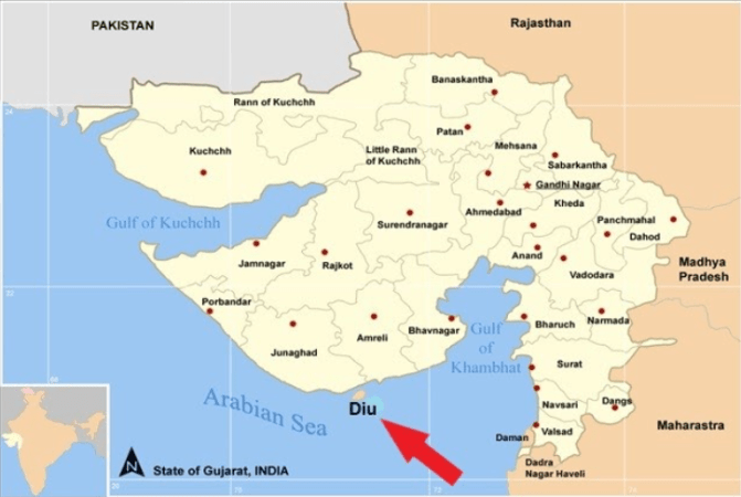 As you can see on the map, there is an island called “Diu”. It was indeed a Portuguese colony, the Portuguese fort still exists there.
