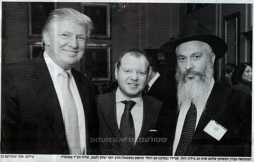 Page from Hebrew-language newspaper in Israel showing Donald Trump, Alex Schneider, and rabbi Yosef Yitzhak Salzman: