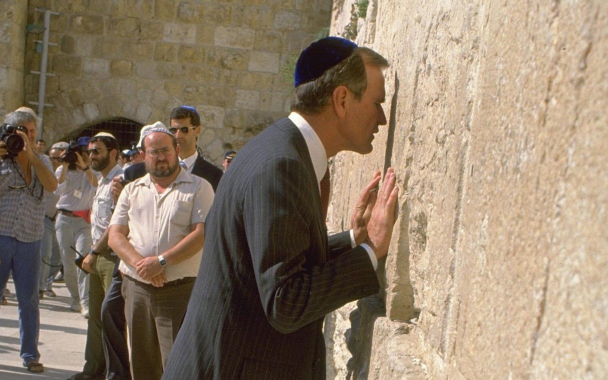 Then US vice president George H.W. Bush prays at the Western Wall in the Old City of Jerusalem. (Government Press Office)