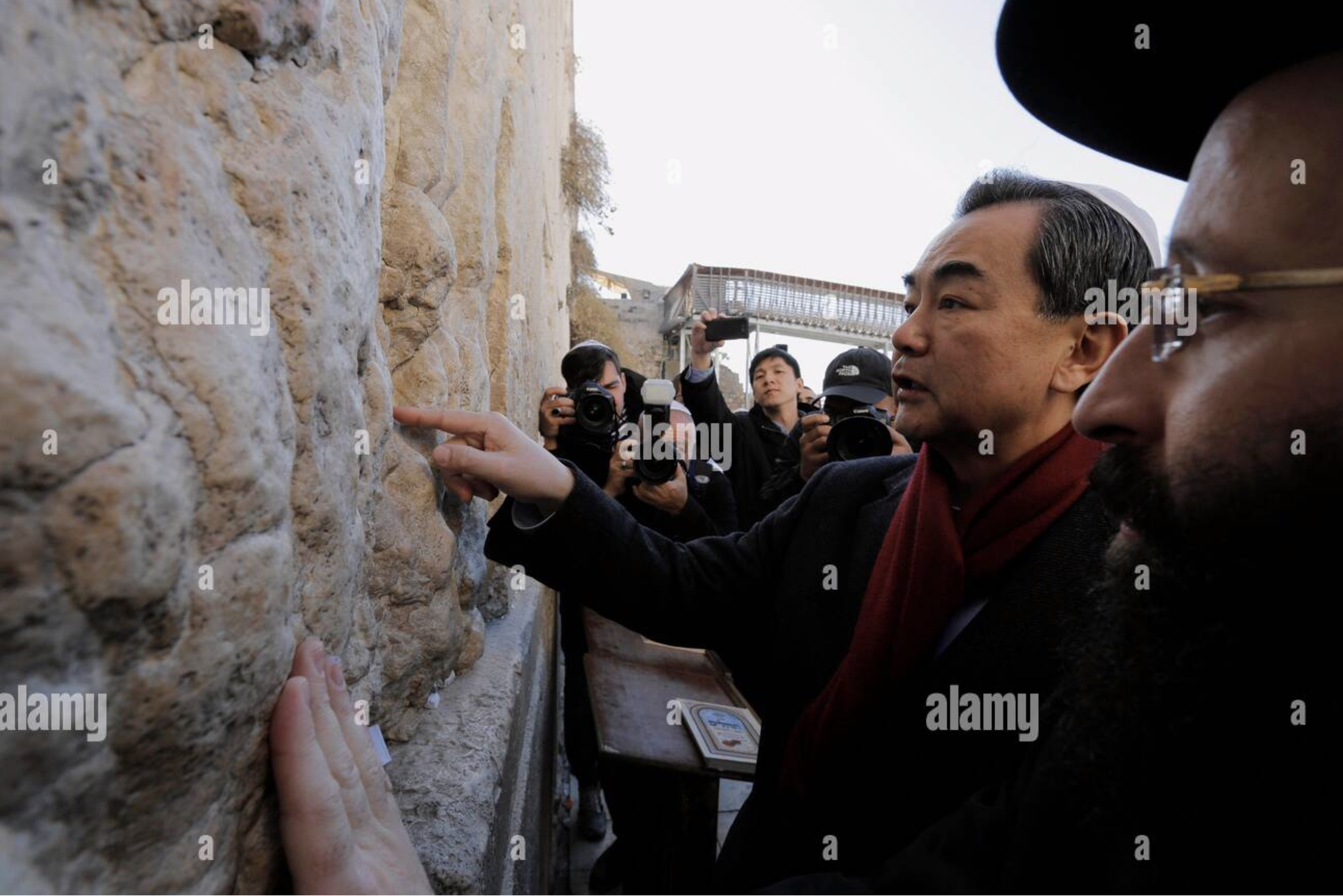 Chinese Foreign Minister Wang Yi (2nd R) stands next to Western Wall Rabbi Shmuel Rabinovitch (R) as he touches the stones of the Western Wall, Judaism’s holiest prayer site, during his visit in Jerusalem’s Old City December 20, 2013. REUTERS/Ammar Awad (JERUSALEM – Tags: POLITICS RELIGION)