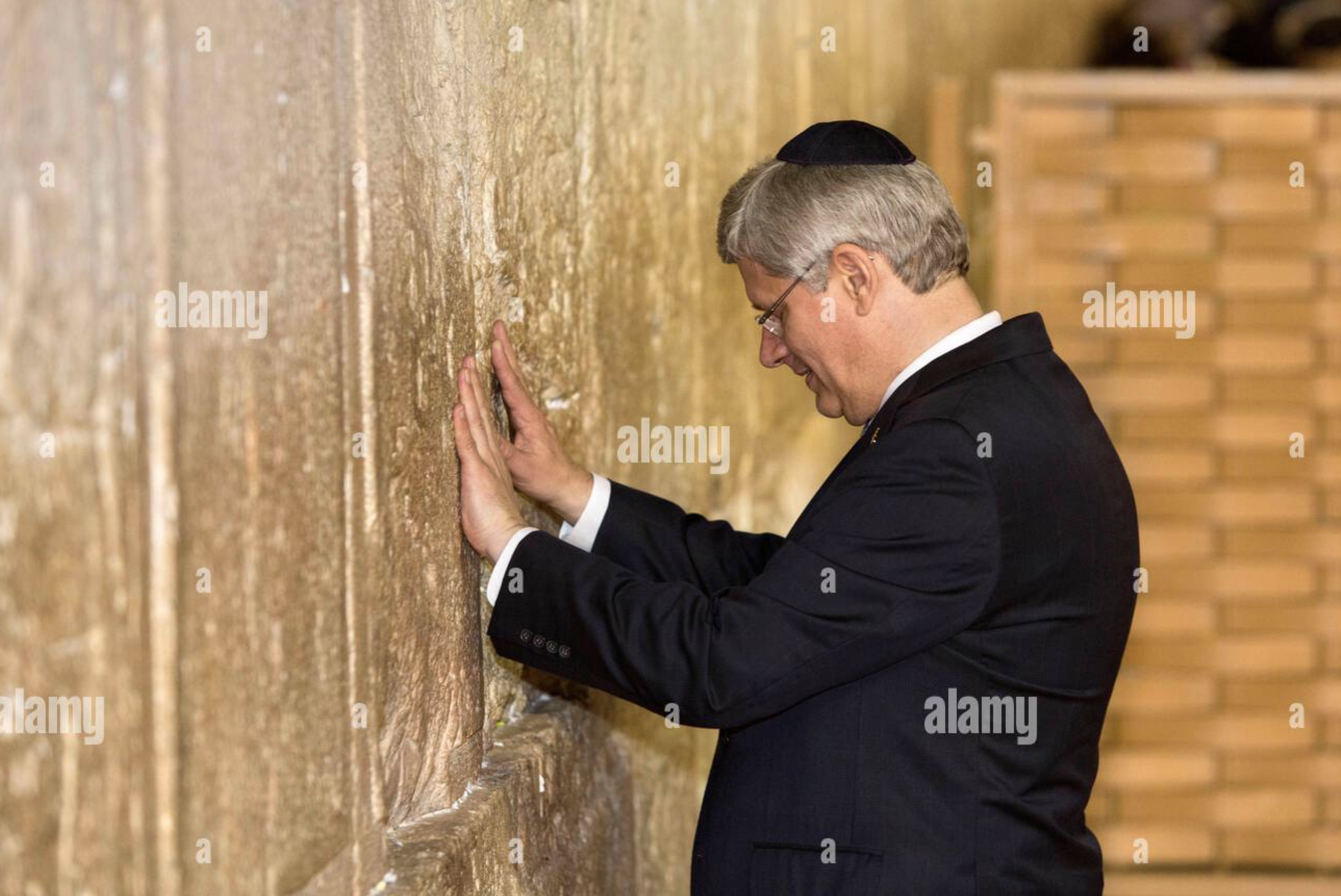 Canadian Prime Minister Stephen Harper touches the stones of the Western Wall, the holiest site where Jews can pray in Jerusalem’s old city, Tuesday, Jan. 21, 2014. Harper is on an official visit to the region. (AP Photo/Sebastian Scheiner)