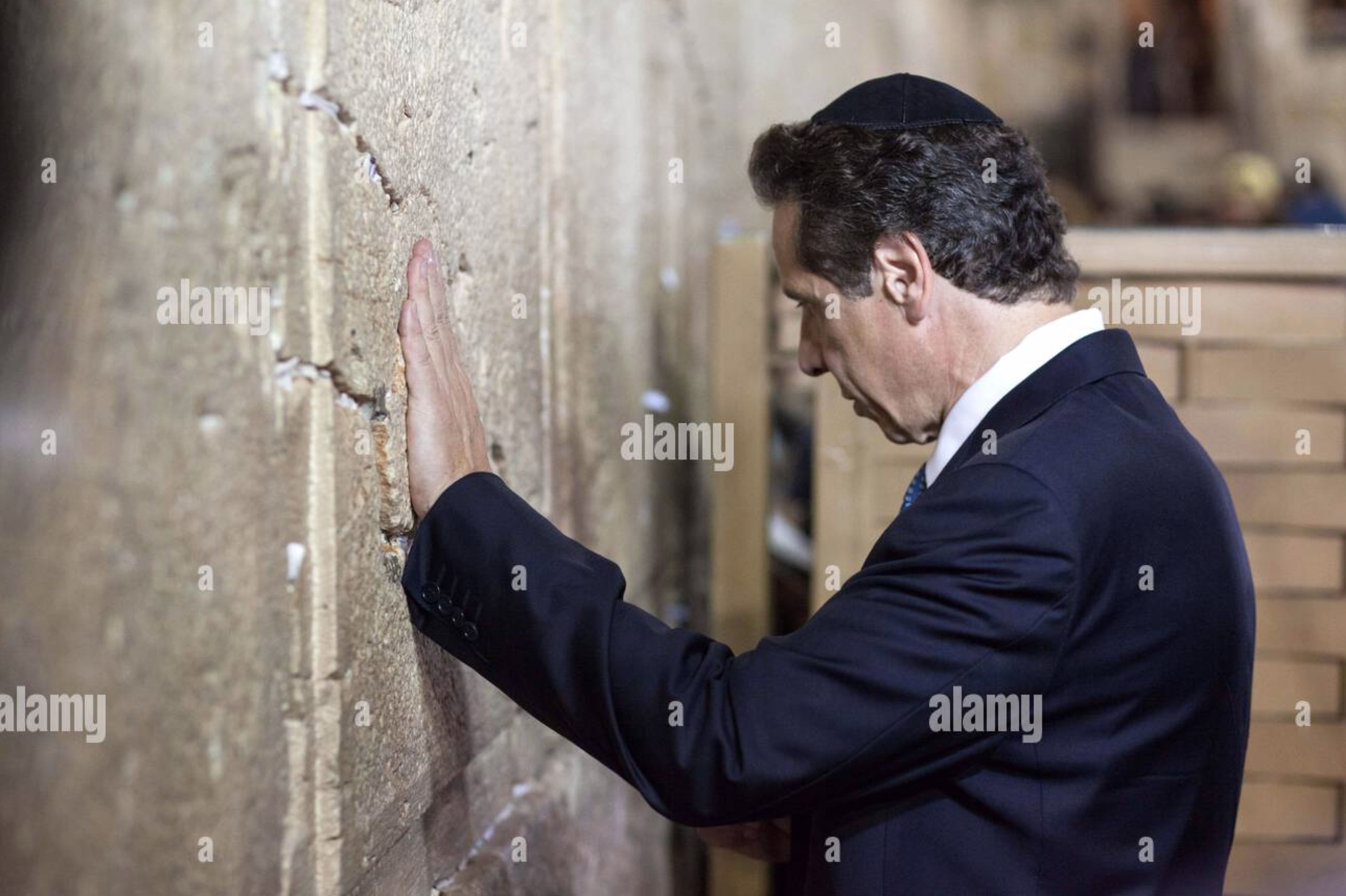 New York Gov. Andrew Cuomo touches the stones of the Western Wall, the holiest site where Jews can pray, during his visit to Jerusalem’s old city, Wednesday, Aug. 13, 2014. (AP Photo/Emil Salman)