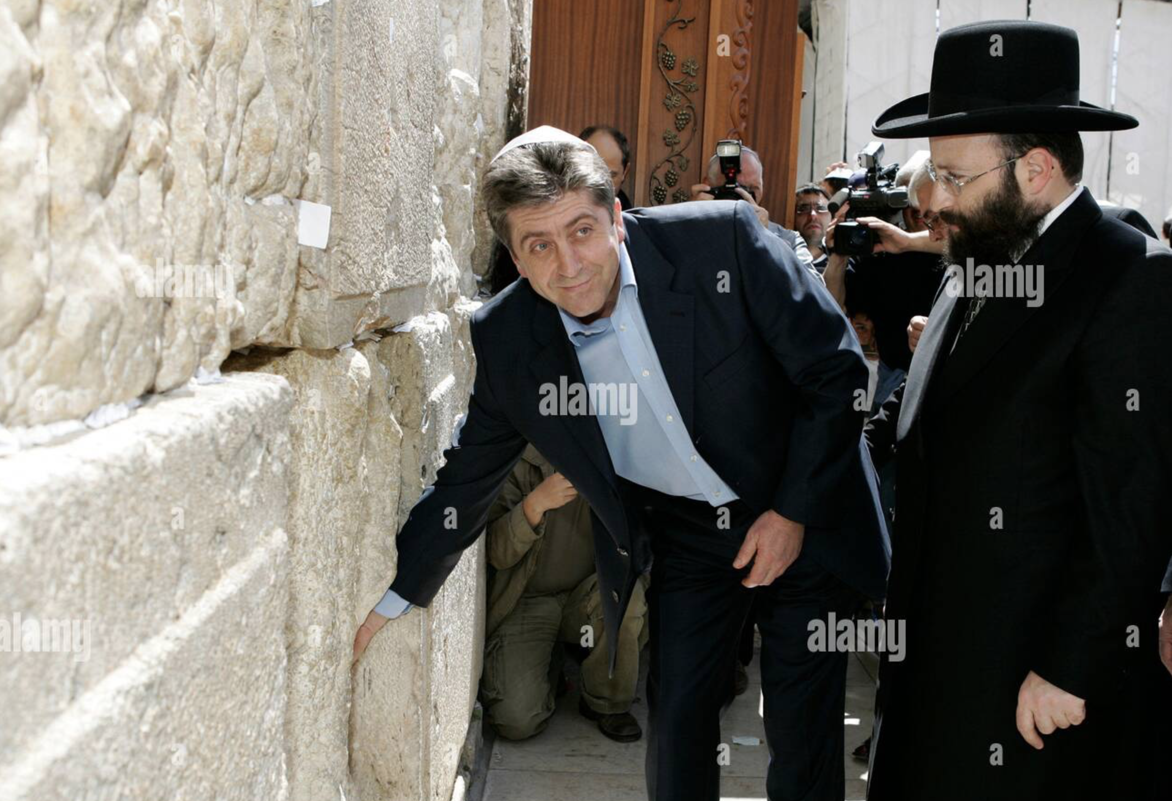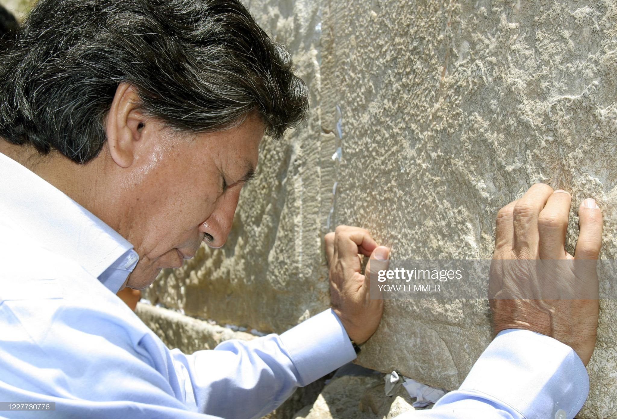 Peruvian President Alejandro Toledo touches the Wailign Wall, which is last remnant of the Second Temple destroyed by the Romans in 70 AD, in Jerusalem 26 May 2005. Toledo winds up a two-day visit to Israel in talks with Israeli Deputy Prime Minister Shimon Peres. AFP PHOTO/YOAV LEMMER (Photo by YOAV LEMMER / AFP) (Photo by YOAV LEMMER/AFP via Getty Images)