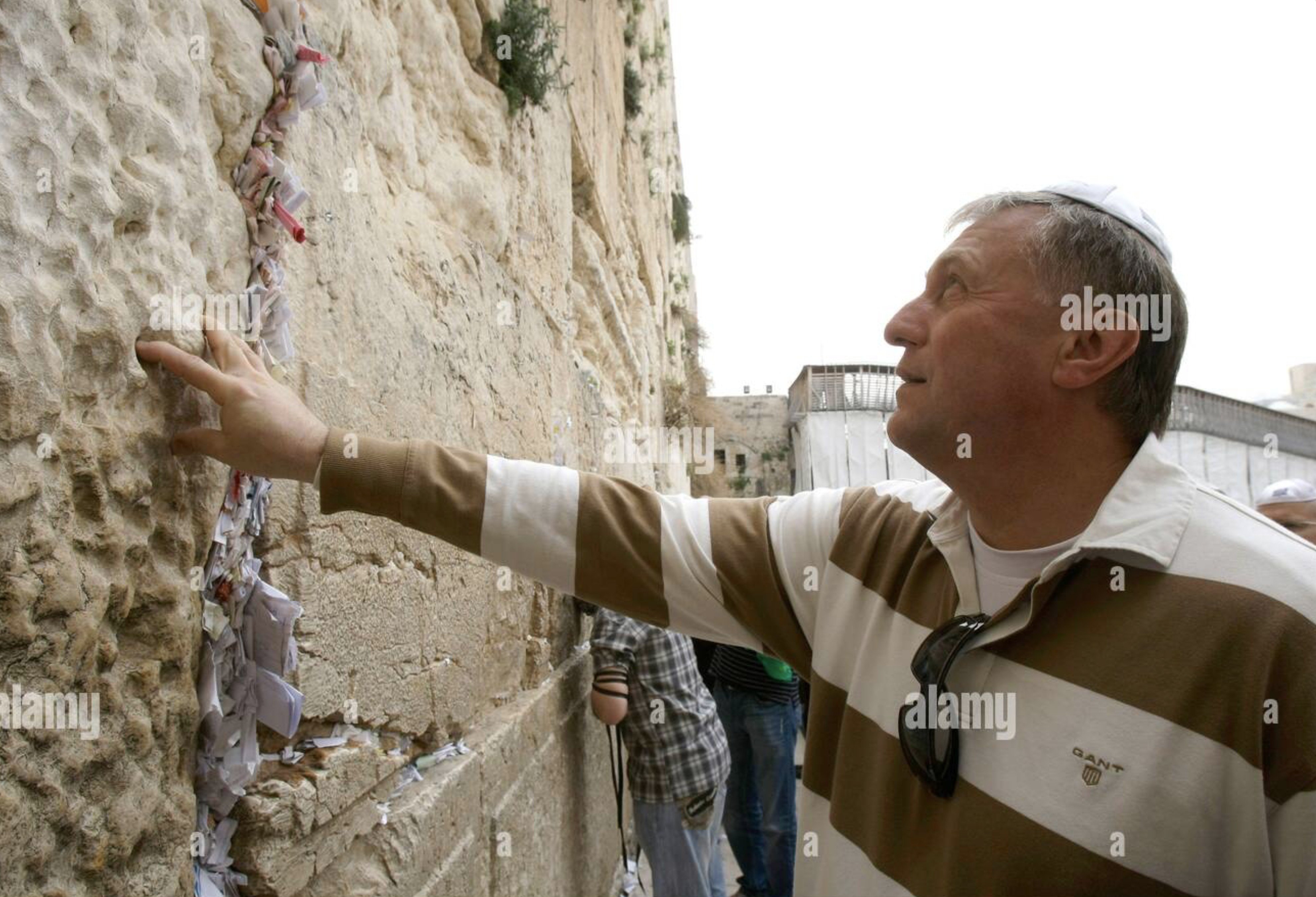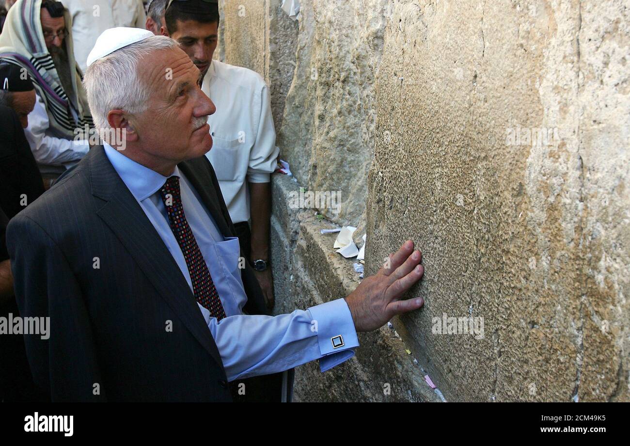 Czech Republic President Vaclav Klaus places his hand on the Western Wall, Judaism’s holiest site, during his visit to the Old City of Jerusalem September 15, 2005. REUTERS/Stefano Rellandini SHP/mk