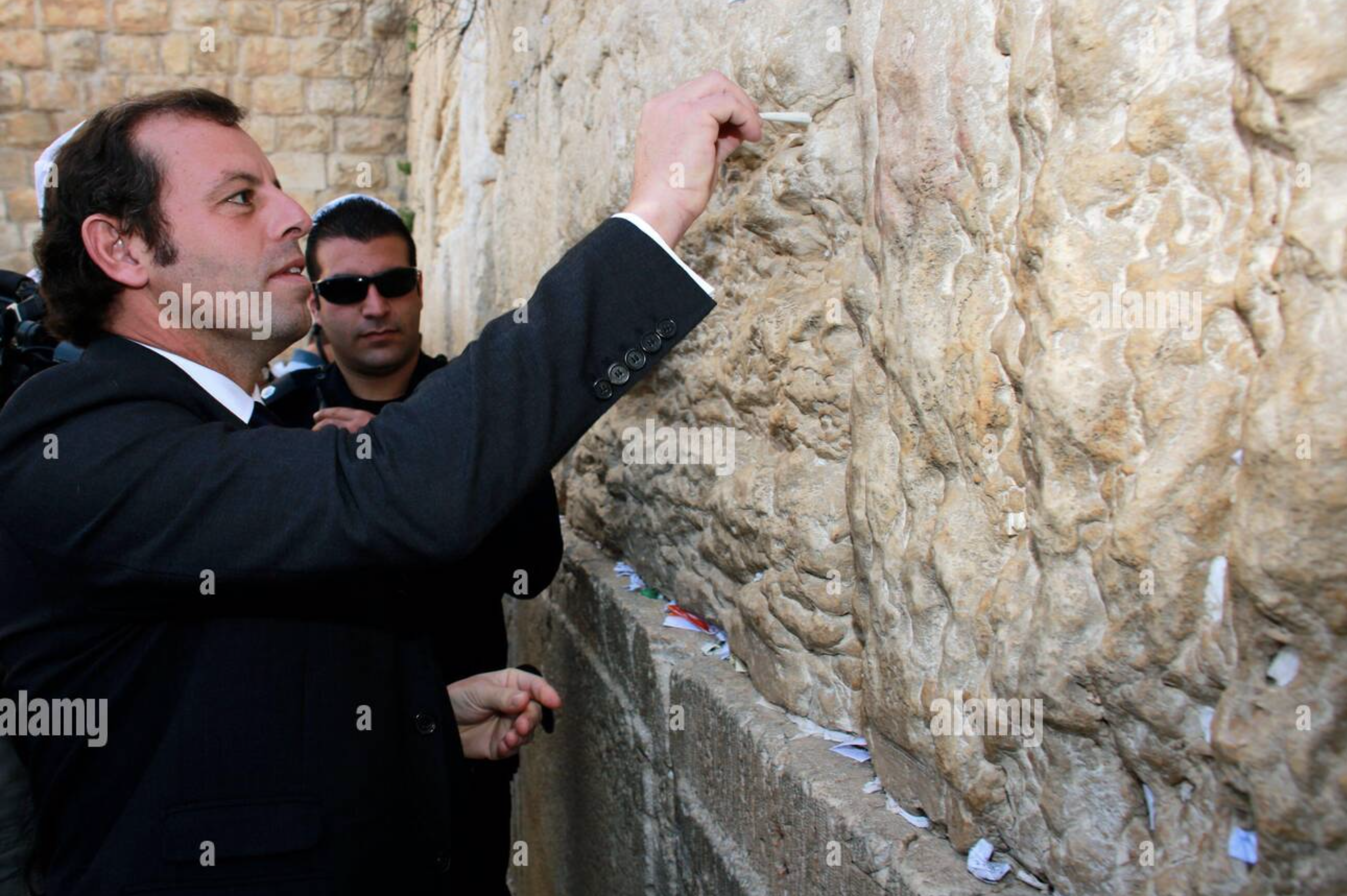 Barcelona soccer team President Sandro Rosell puts a note in between the rocks of the Western Wall in Jerusalem during a visit in Israel and the Palestinian Territories February 22, 2013. Rosell announced on Thursday that the Catalonian giants will play a friendly match against a joint Israeli-Palestinian team on July 31. REUTERS/Daniel Bar On (JERUSALEM – Tags: POLITICS SPORT SOCCER)