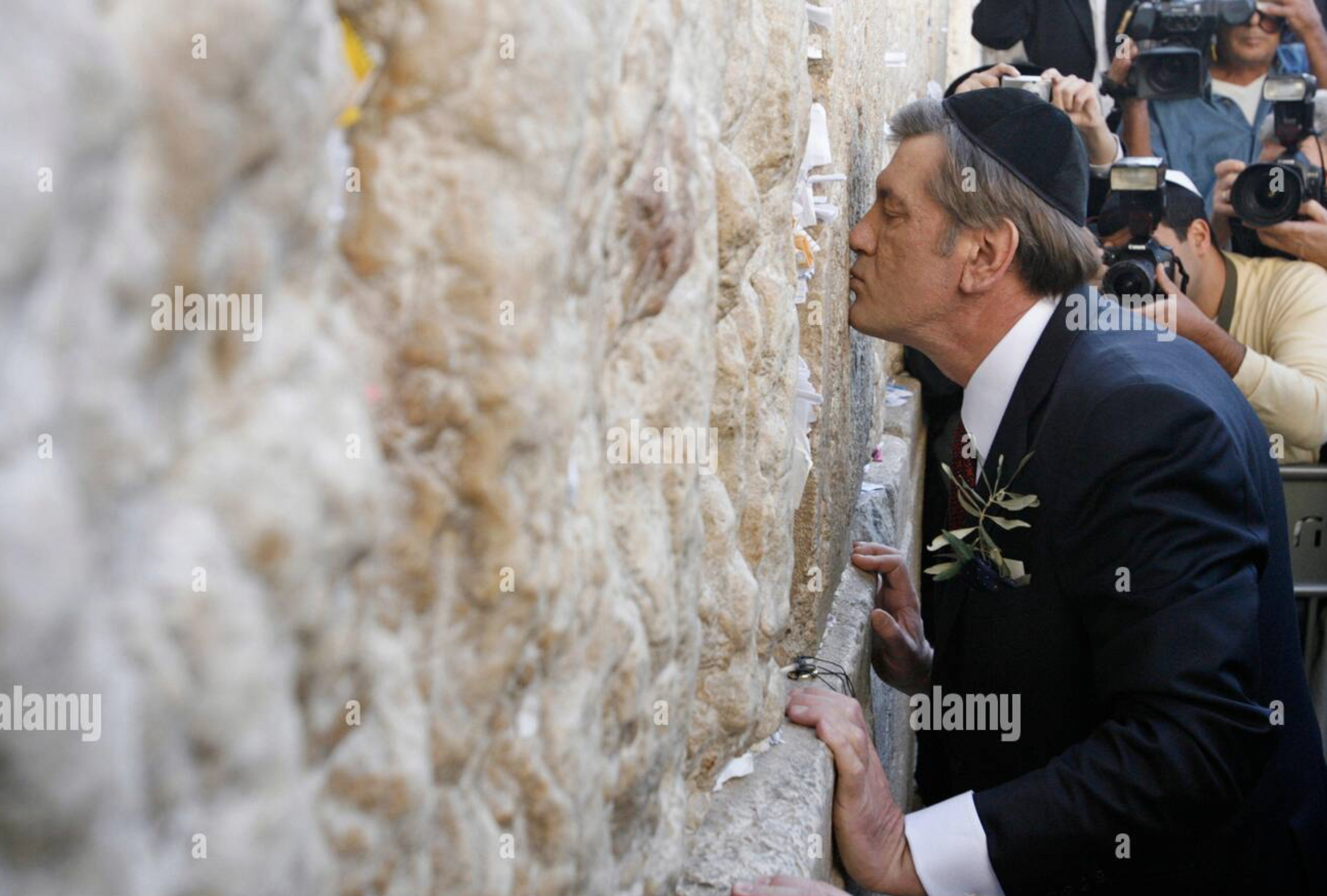 Ukraine’s President Victor Yushchenko kisses the stones of the Western Wall, Judaism’s holiest prayer site, during his visit to the Old City of Jerusalem November 14, 2007. REUTERS/Oleg Popov (JERUSALEM)