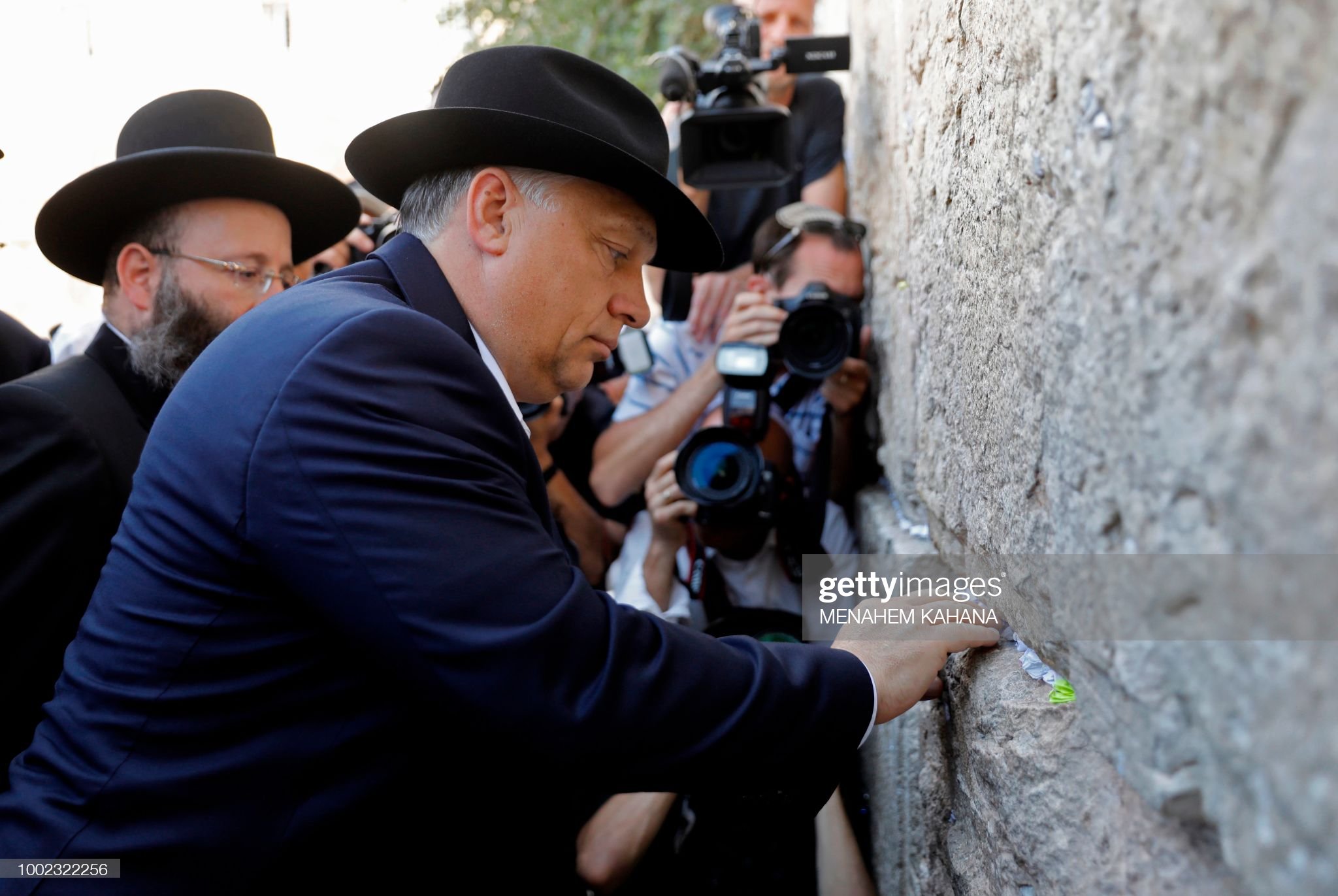 Hungarian Prime Minister Viktor Orban places a paper note at the Western Wall in Jerusalem’s Old City during his visit to Israel on July 20, 2018. – The Hungarian Prime Minister pledged “zero tolerance” for anti-Semitism on July 19, 2018, during a controversial visit to Israel after facing accusations of stoking anti-Jewish sentiment back home.Orban and Israeli Prime Minister Benjamin Netanyahu have found common cause in their right-wing views despite controversy surrounding the Hungarian leader’s nationalist rhetoric. (Photo by MENAHEM KAHANA / AFP) (Photo credit should read MENAHEM KAHANA/AFP via Getty Images)