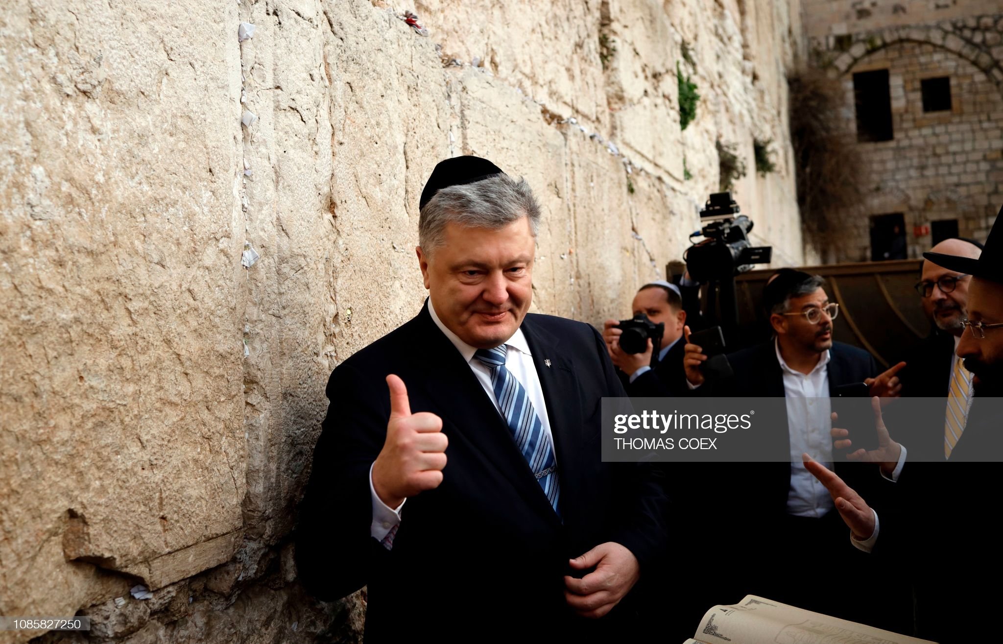 Ukraine’s President Petro Poroshenko gestures after prayer on the Western Wall in the Old City of Jerusalem, during an official visit on January 21, 2019. (Photo by Thomas COEX / AFP) (Photo credit should read THOMAS COEX/AFP via Getty Images)