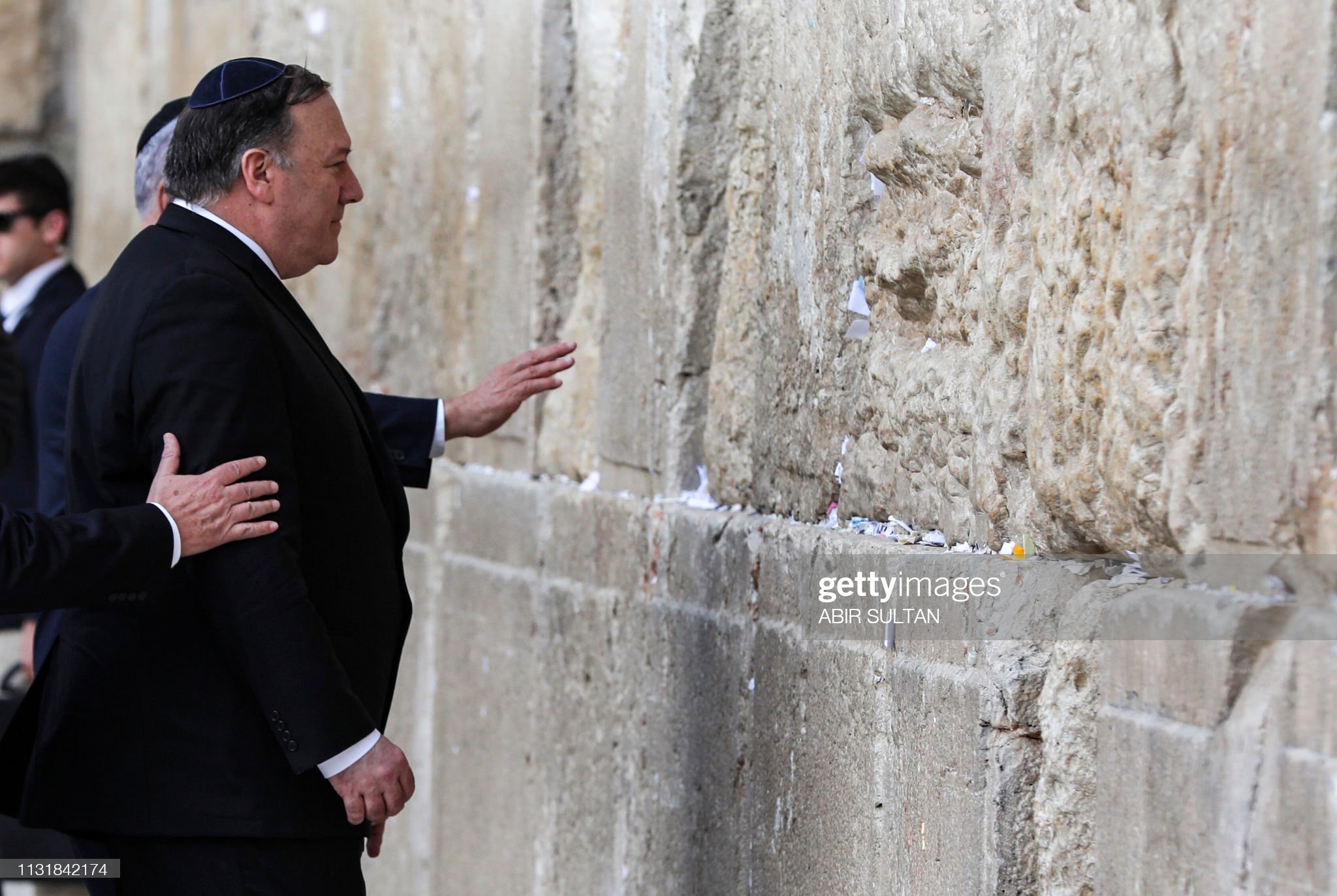 US Secretary of State Mike Pompeo prepares to touch the stones of the Western Wall in Jerusalem’s Old City on March 21, 2019, during the second day of his visit as part of his five-day regional tour of the Middle East. (Photo by Abir SULTAN / POOL / AFP) (Photo credit should read ABIR SULTAN/AFP via Getty Images)