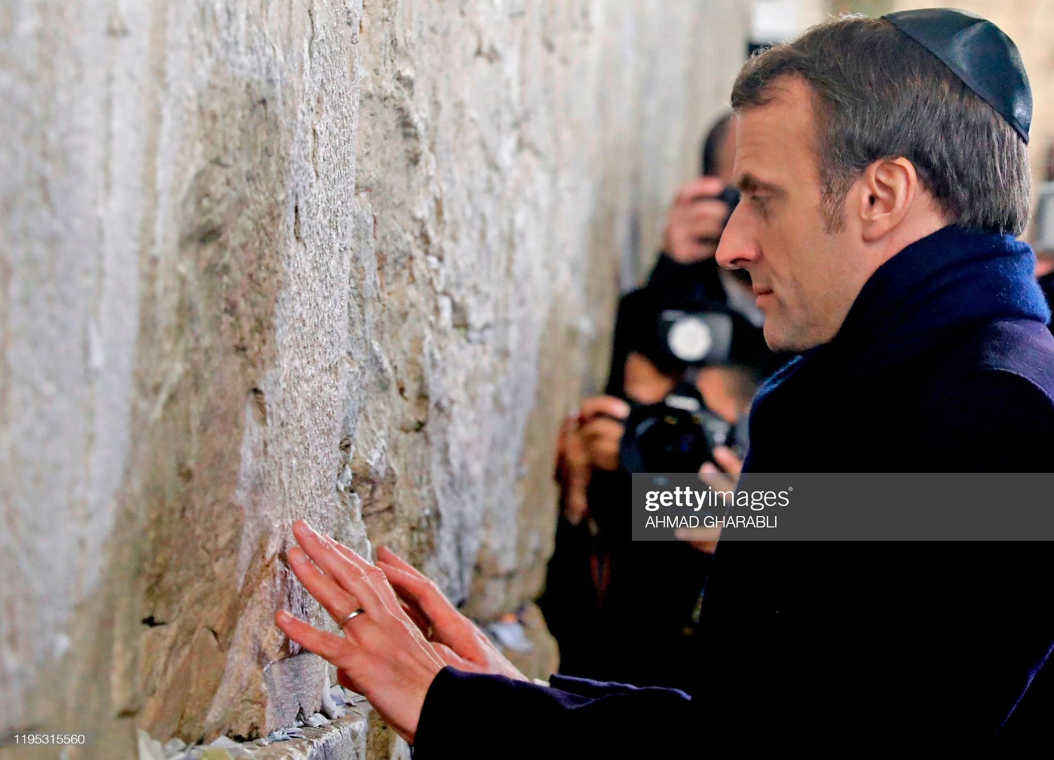 French President Emmanuel Macron prays at the Western Wall, Judaism’s holiest prayer site, in Jerusalem’s Old City on January 22, 2020. – World leaders are to travel to Israel this week to mark 75 years since the Red Army liberated Auschwitz, the extermination camp where the Nazis killed over a million Jews. Thousands of police officers and other security forces will deploy from today, ahead of the arrival of dignitaries including Russian President Vladimir Putin, French President Emmanuel Macron and US Vice President Mike Pence. (Photo by Ahmad GHARABLI / AFP) (Photo by AHMAD GHARABLI/AFP via Getty Images)