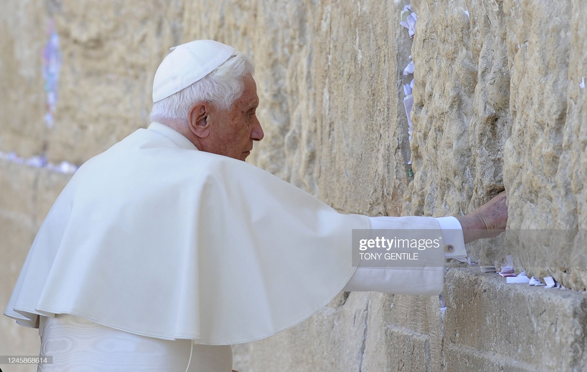 Pope Benedict XVI leaves a note in the Western Wall, Judaism’s holiest prayer site, in Jerusalem’s Old City May 12, 2009. The pope earlier visited the Dome of the Rock, a Muslim shrine just above the Western Wall, and was to celebrate mass later in the day. AFP PHOTO /POOL/TONY GENTILE (Photo by TONY GENTILE / POOL / AFP) (Photo by TONY GENTILE/POOL/AFP via Getty Images)