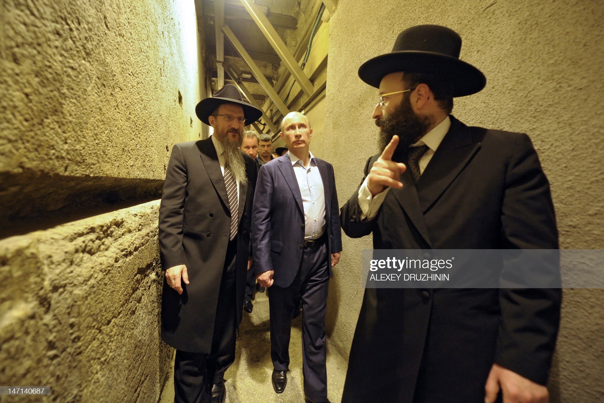 Russian President Vladimir Putin (2nd L) and Russia’s chief Rabbi Berel Lazar (L) visit the Western Wall, Judaism’s holiest prayer site, in Jerusalem’s Old City on June 26, 2012. Putin was to meet Palestinian president Mahmud Abbas in the West Bank town of Bethlehem during a rare trip aimed at boosting Russia’s regional role. AFP PHOTO/RIA-NOVOSTI/POOL/ALEXEY DRUZHININ (Photo credit should read ALEXEY DRUZHININ/AFP/GettyImages)