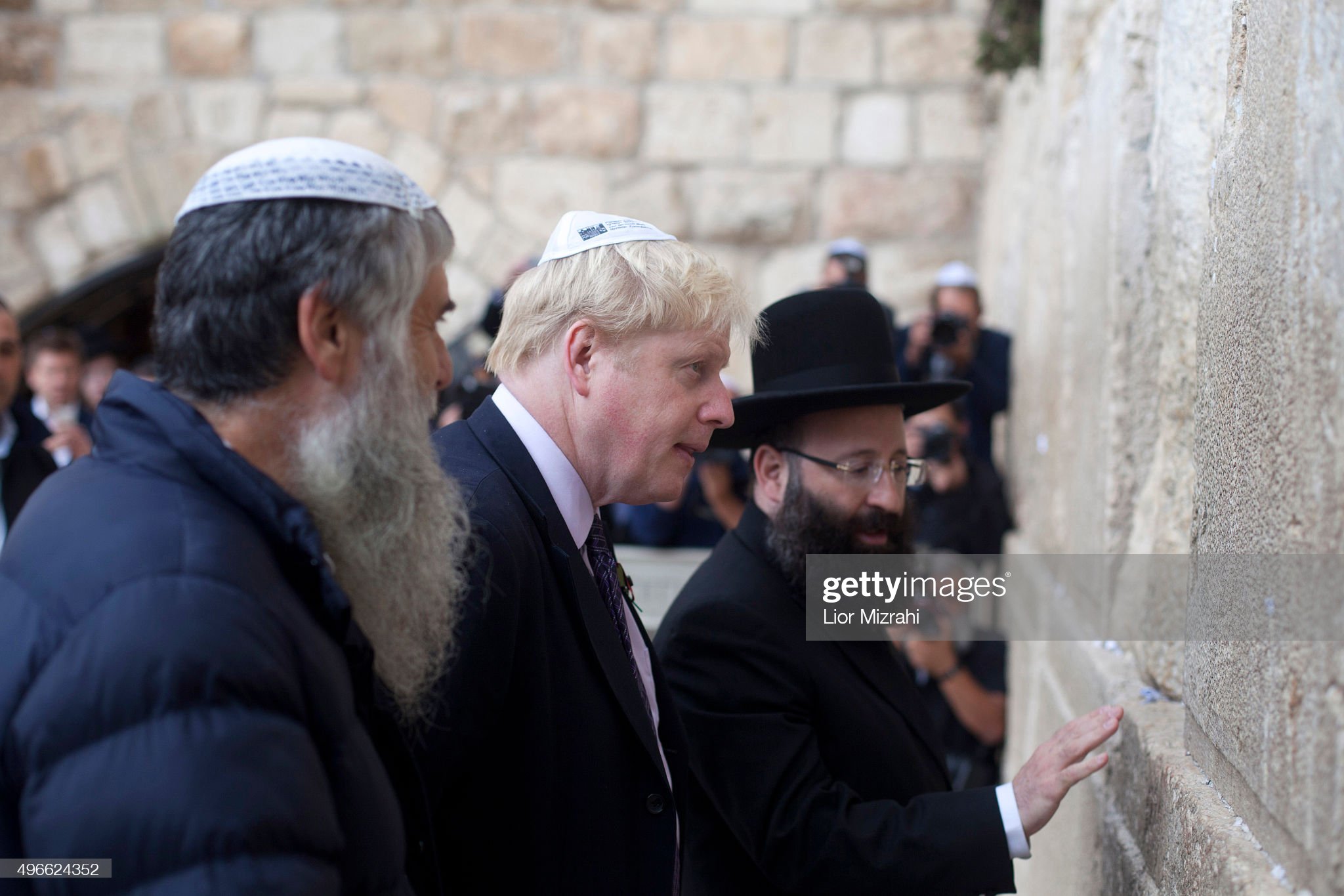JERUSALEM, ISRAEL – NOVEMBER 11: Mayor of London, Boris Johnson (C) and Rabbi Shmuel Rabinovitch (R) visit the Western Wall, Judaism’s holiest site, on November 11, 2015 in Jerusalem’s Old City, Israel. Johnson arrived in Israel on Monday in a bid to boost London’s economic ties with the region. The Mayor began his visit in Tel Aviv before travelling to Jerusalem and then onto Palestine’s city of Ramallah. (Photo by Lior Mizrahi/Getty Images)