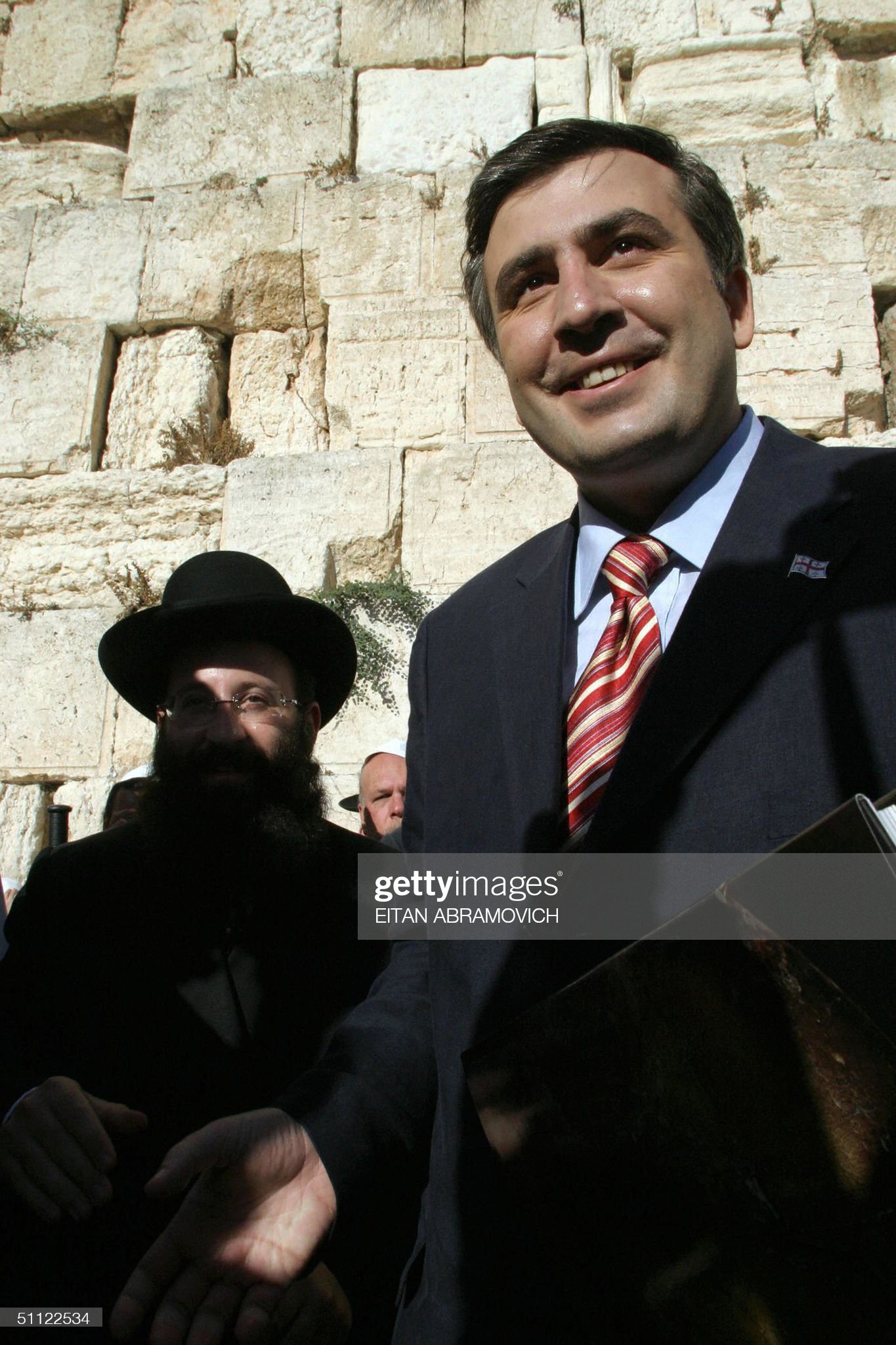 JERUSALEM, -: Georgian President Mikhail Saakashvili visits the Western Wall, Judaism’s holiest place in Jerusalem, 28 July 2004. This is the Georgian leader’s first trip to Israel since he assumed power in January after toppling the decade-old regime of Eduard Shevardnadze. The vast majority of new immigrants to Israel in recent years have come from former Soviet republics such as Georgia which has a 30,000-strong Jewish community. AFP PHOTO/Eitan ABRAMOVICH (Photo credit should read EITAN ABRAMOVICH/AFP via Getty Images)