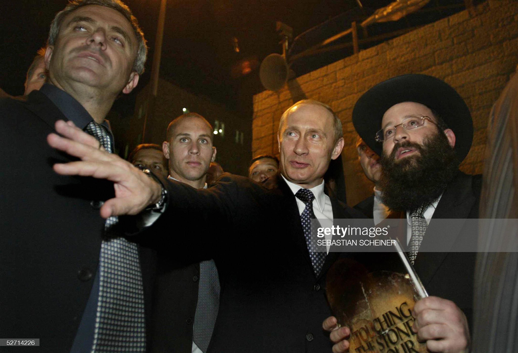 JERUSALEM, -: Russian President Vladimir Putin speaks to Rabbi Shmuel Rabinovitz, during a brief visit to the Western Wall, Judaism holiest site in Jerusalem’s Old City, 27 April 2005. Putin is expected to hold talks with Israeli Prime Minister Ariel Sharon and President Katsav on Thursday before heading to the West Bank city of Ramallah for a meeting on Friday with Palestinian leader Mahmud Abbas. AFP PHOTO SEBASTIAN SCHEINER +++ISRAEL OUT+++ (Photo credit should read SEBASTIAN SCHEINER/AFP via Getty Images)