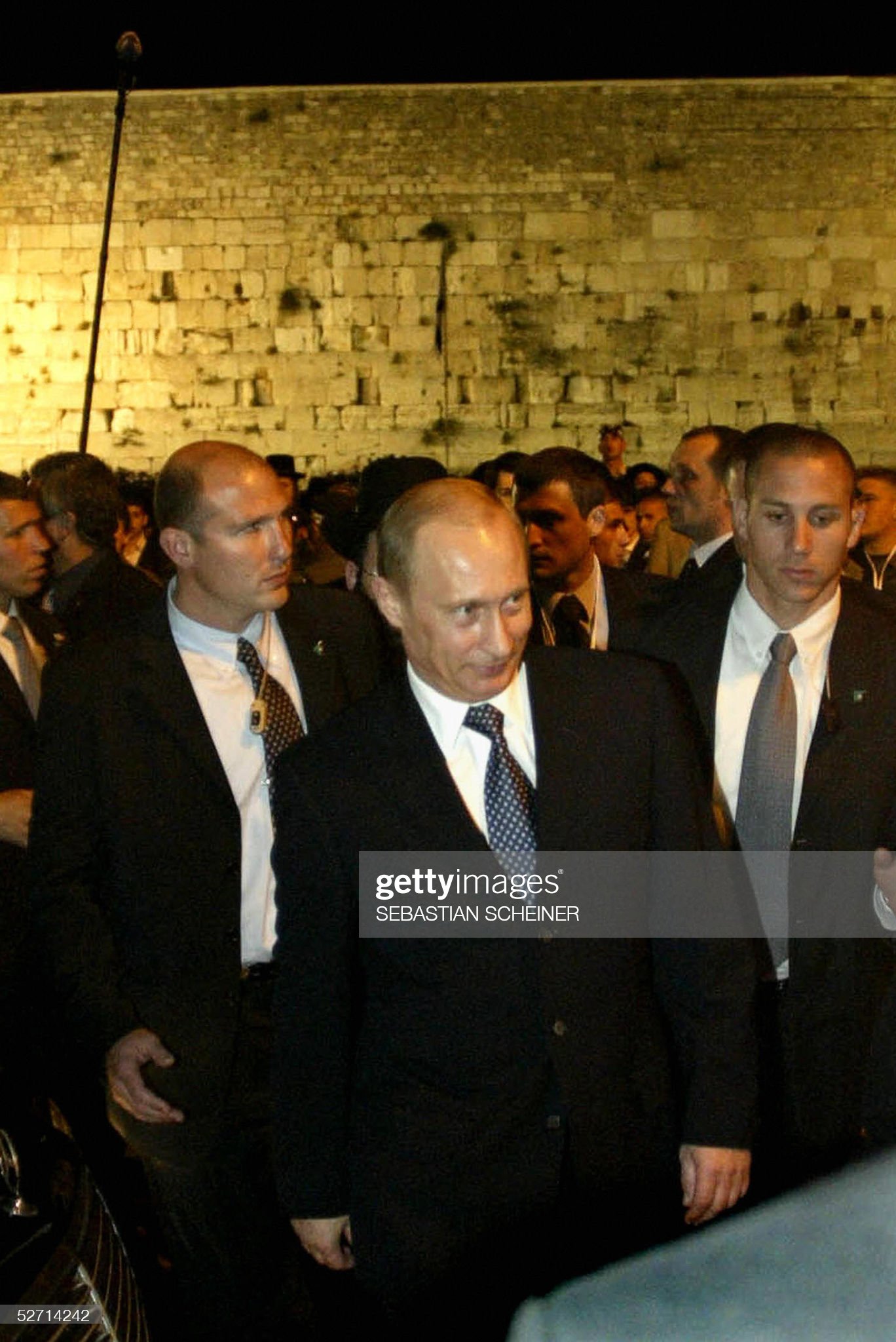 JERUSALEM, -: Escorted by bodyguards, Russian President Vladimir Putin (C) visits the Western Wall, Judaism’s holiest site in Jerusalem’s Old City, 27 April 2005. Putin is expected to hold talks with Israeli Prime Minister Ariel Sharon and President Katsav on Thursday before heading to the West Bank city of Ramallah for a meeting on Friday with Palestinian leader Mahmud Abbas. AFP PHOTO/SEBASTIAN SCHEINER +++ISRAEL OUT+++ (Photo credit should read SEBASTIAN SCHEINER/AFP via Getty Images)