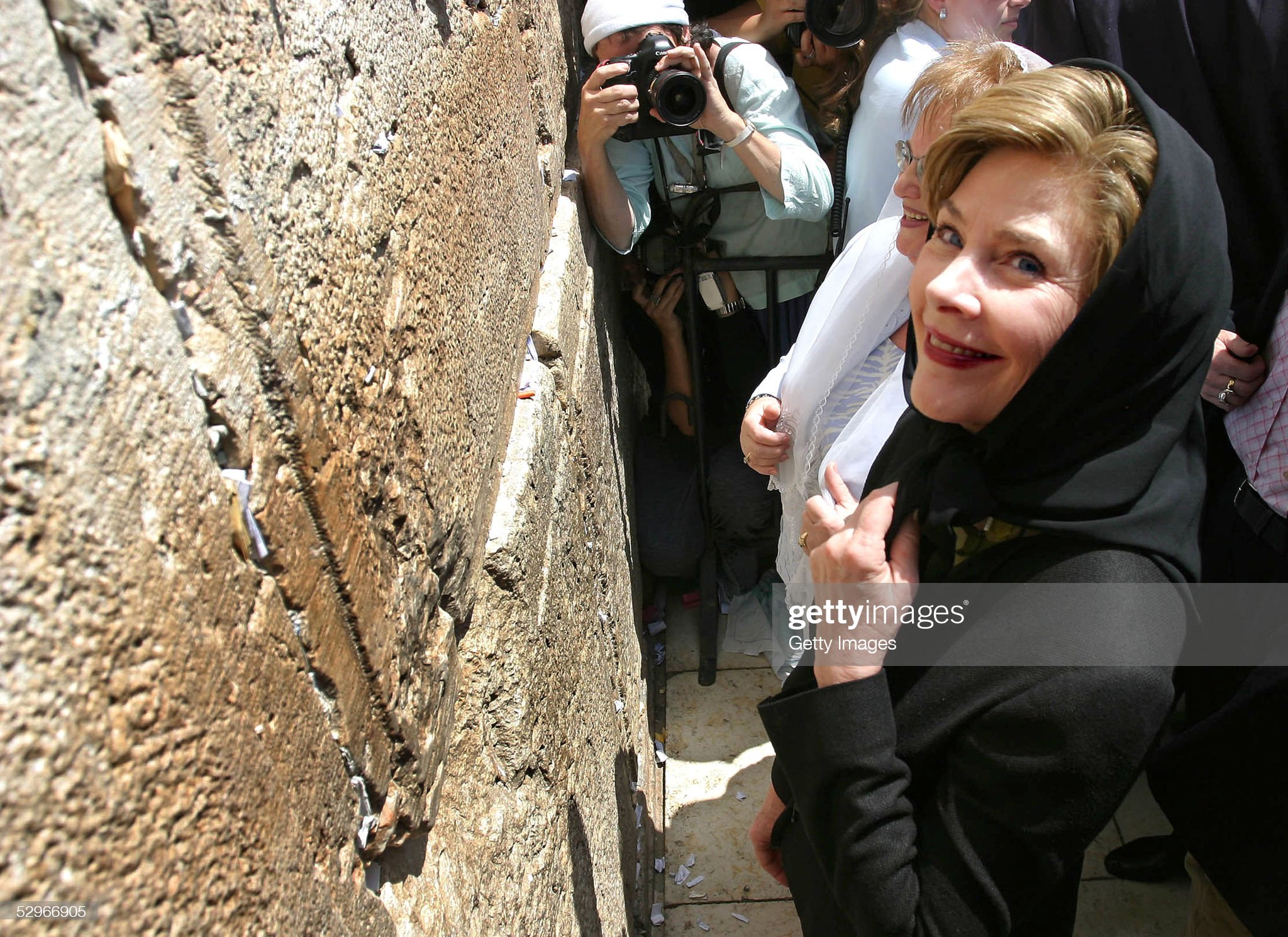 JERUSALEM, ISRAEL – MAY 22: US First Lady Laura Bush vists the Western Wall, Judaism’s holiest site May 22, 2005 in Jerusalem’s Old City. Bush, who also visited al-Aqsa mosque compound, Islam’s third most sacred shrine, is on a two-day visit to Israel and the Palestinian territories as part of a six-day regional tour. (Photo by Brian Hendler/Getty Images)