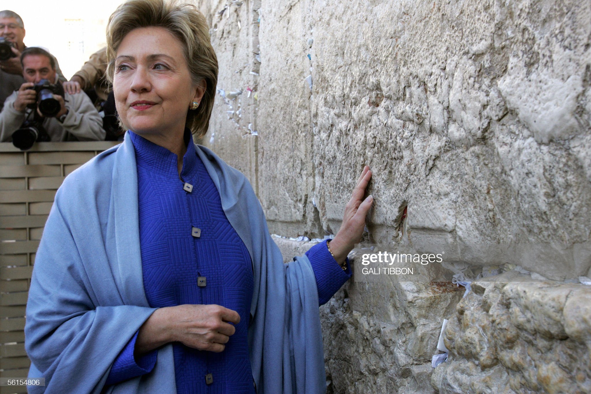 JERUSALEM, : US senator Hillary Rodham Clinton touches the Western Wall, Judaism most holy site, during her visit in Jerusalem 14 November 2005. Israel commemorates 10 years since the murder of Premier Yitzhak Rabin with a series of official remembrance events attended by Israeli leaders and dozens of foreign dignitaries. AFP PHOTO/GALI TIBBON (Photo credit should read GALI TIBBON/AFP via Getty Images)