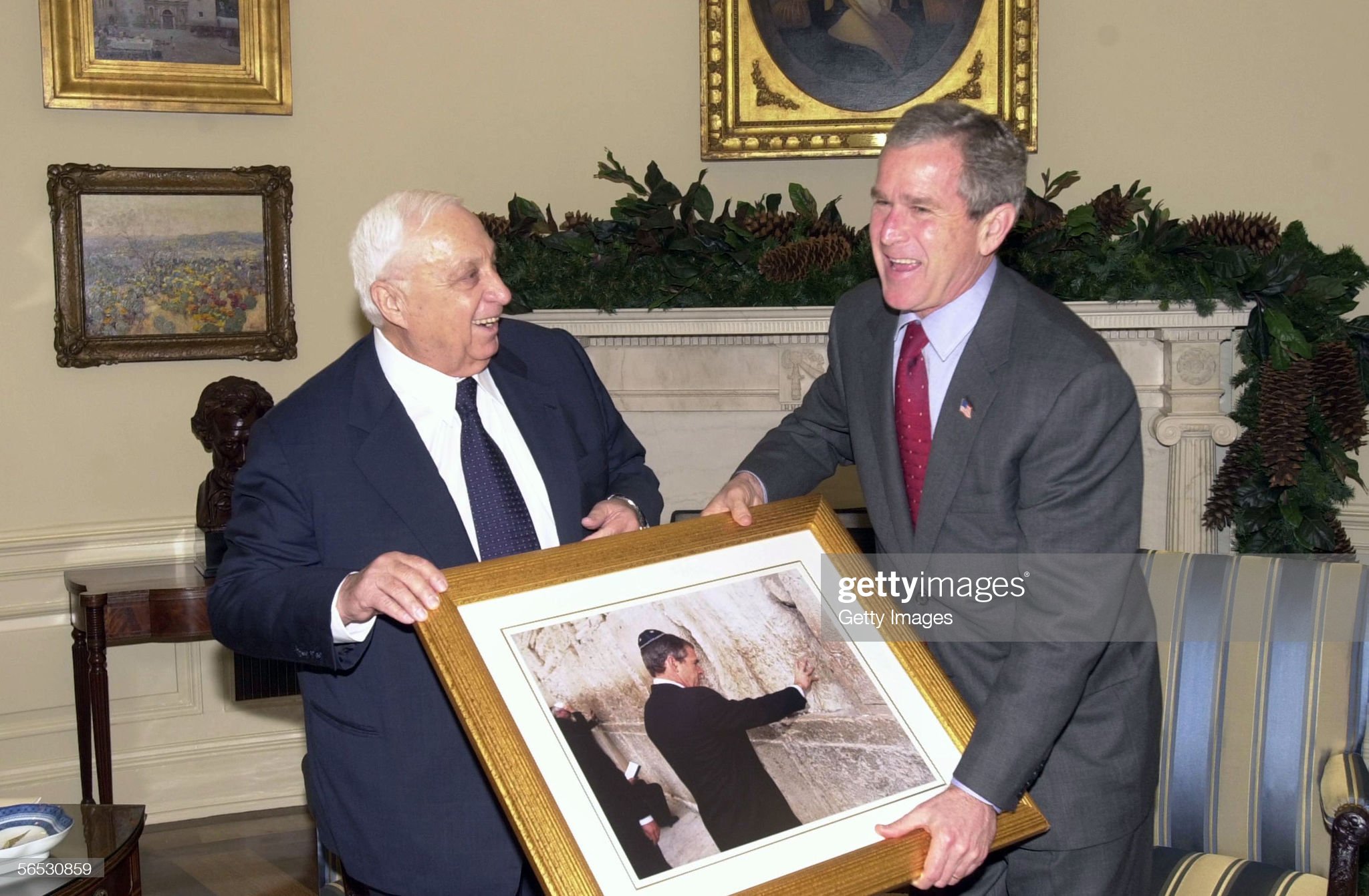 WASHINGTON DC – DECEMBER 2, 2001: (ISRAEL OUT) In this handout provided by the Israeli Governmental Press Office, visiting Israeli Prime Minister Ariel Sharon presents his host US President George W. Bush a photo of himself during a visit to the Western Wall, Judaism’s holiest site, at the start of their meeting December 2, 2001 in the White House in Washington DC, USA. (Photo by Amos Ben Gershom/GPO via Getty Images)