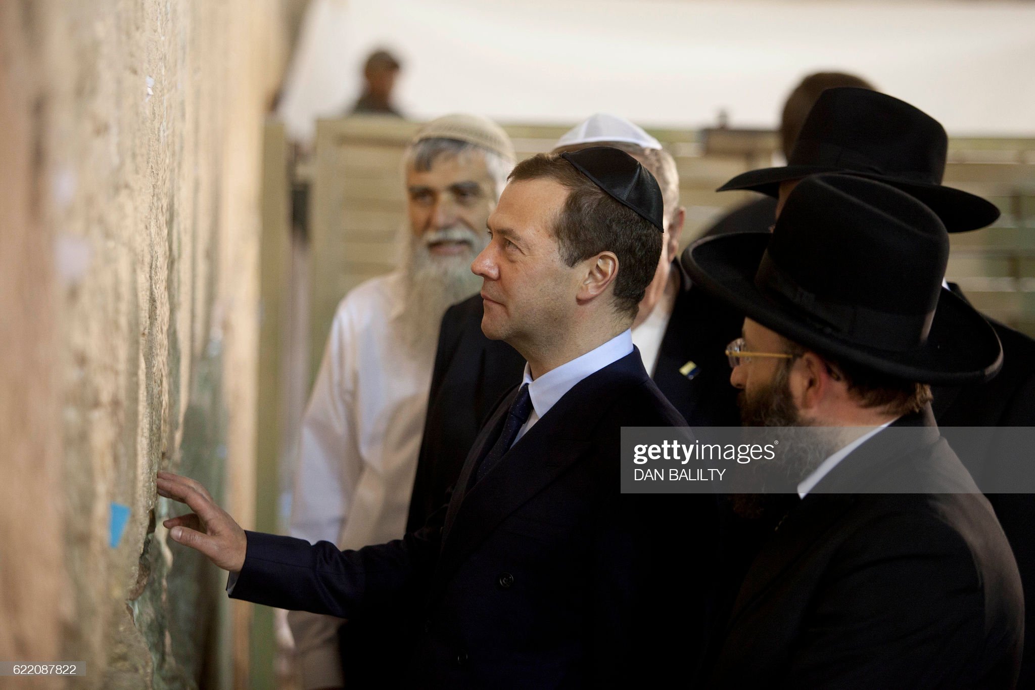 Russian Prime Minister Dmitry Medvedev touches the Western Wall, the holiest site where Jews can pray in Jerusalem’s Old City in Jerusalem, on November 10, 2016. / AFP / POOL / Dan Balilty (Photo credit should read DAN BALILTY/AFP via Getty Images)