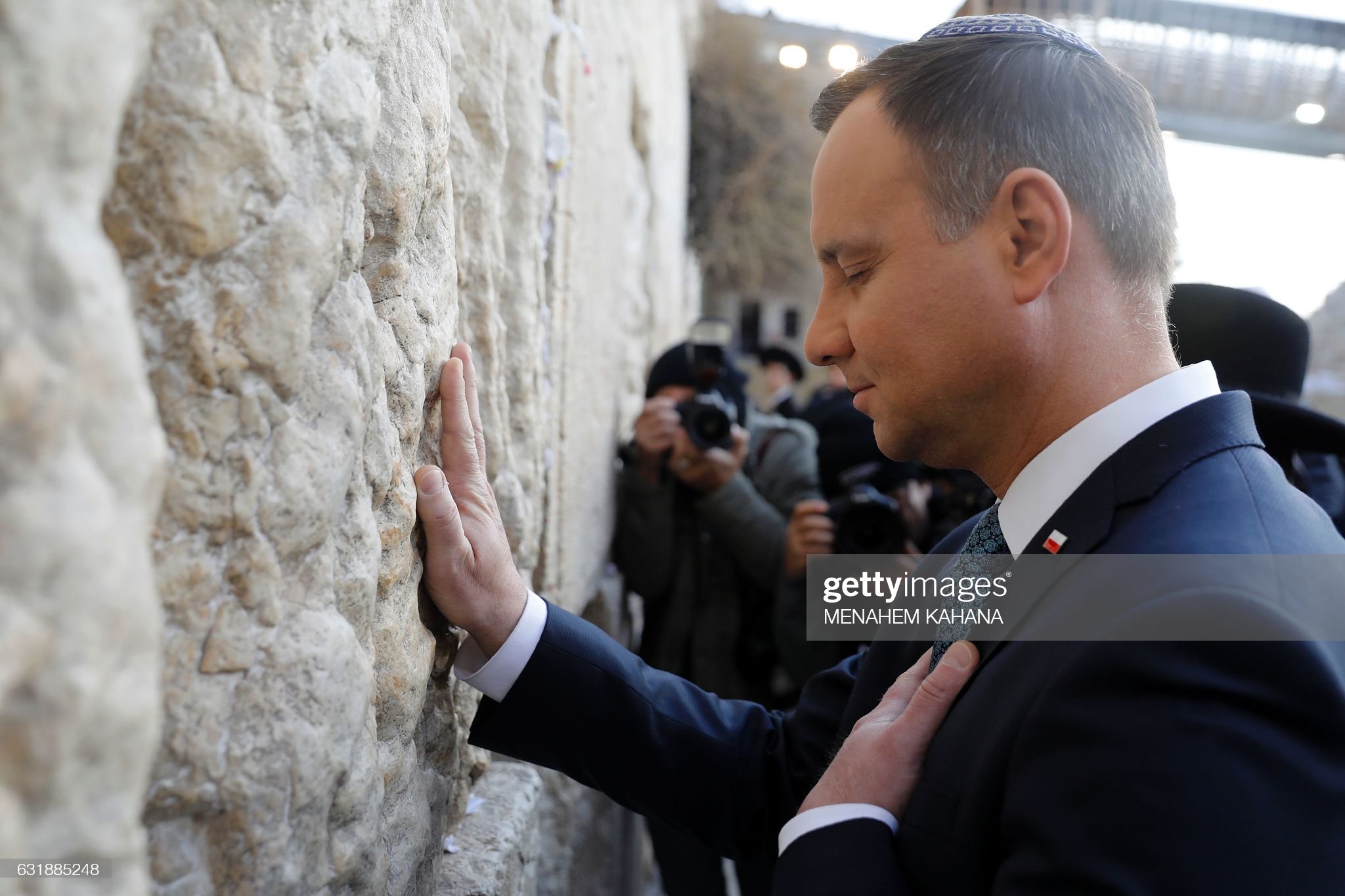 Polish President Andrzej Duda, touches the Western Wall, during a visit on January 17, 2017, in Jerusalem’s Old City. / AFP / MENAHEM KAHANA (Photo credit should read MENAHEM KAHANA/AFP via Getty Images)