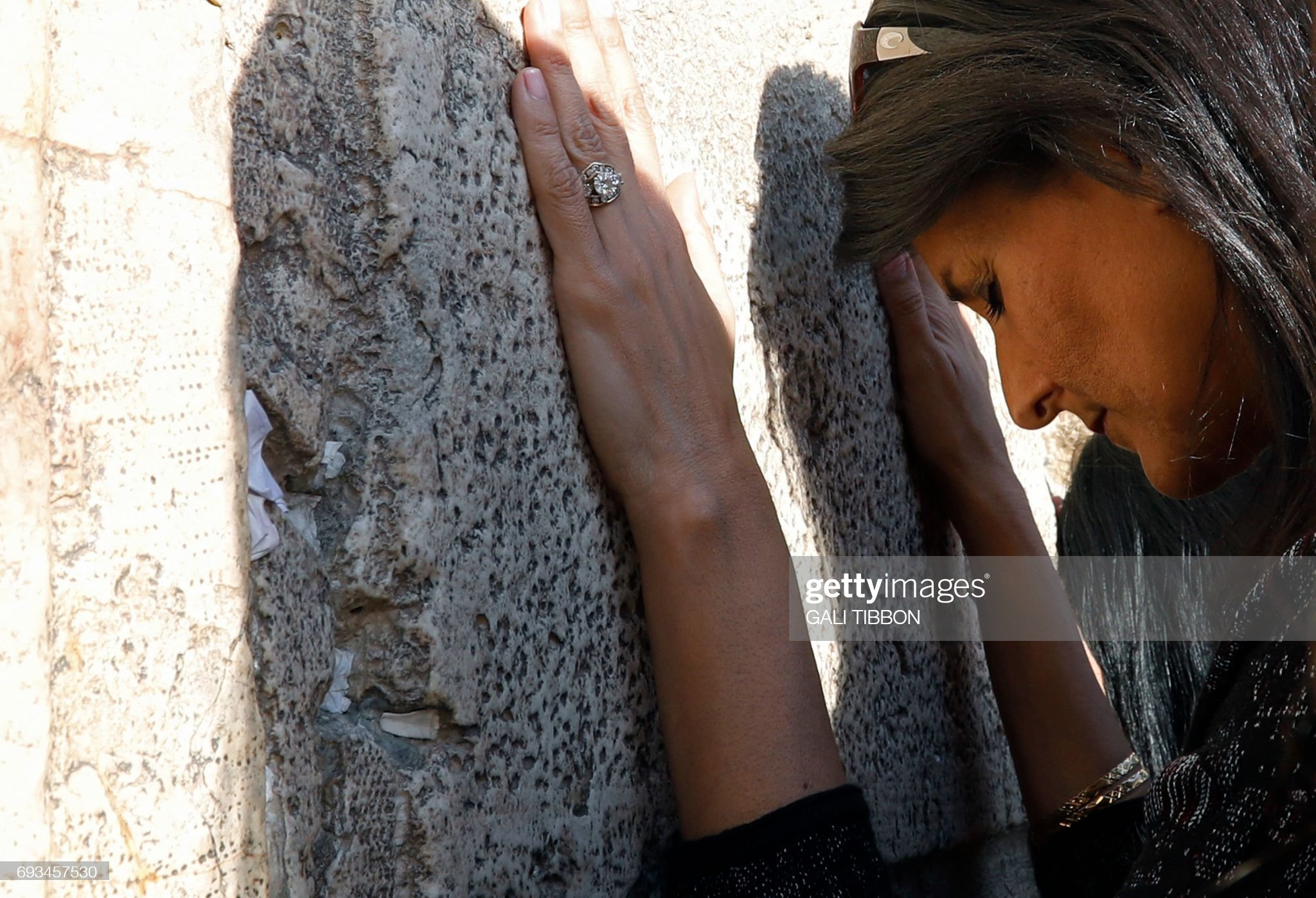US Ambassador to the United Nations Nikki Haley prays at the Western Wall, the holiest site where Jews can pray in Jerusalem’s Old City on June 7, 2017. (Photo by Gali TIBBON / AFP) (Photo by GALI TIBBON/AFP via Getty Images)