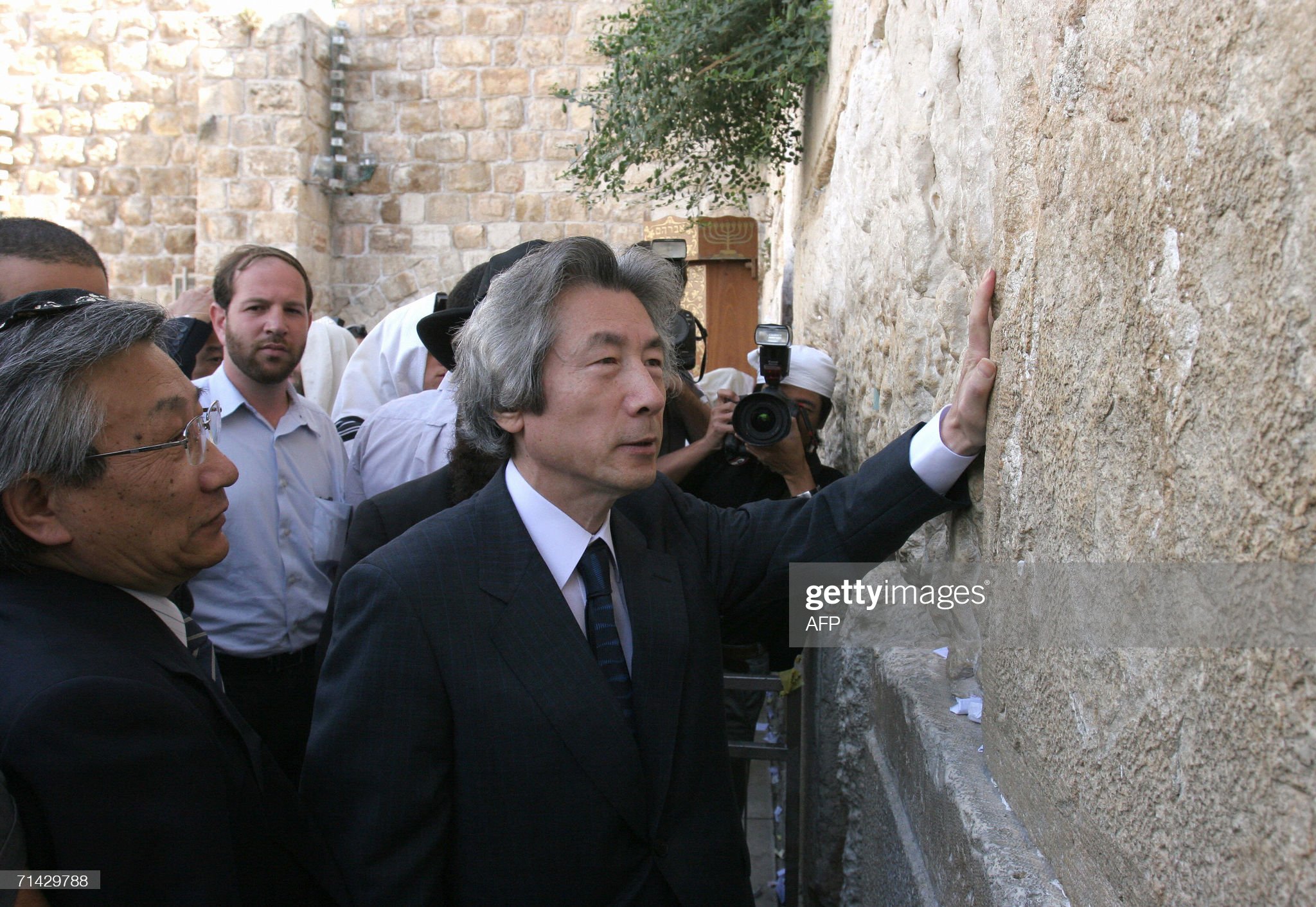 JERUSALEM, : Japanese Prime Minister Junichiro Koizumi touches the Western Wall, one of Judaism most holy sites, in east Jerusalem 13 July 2006. Koizumi later went to visit Palestinian President Mahmud Abbas for talks in the full glare of an escalating Middle East crisis. Yesterday Koizumi met Israeli Prime Minister Ehud Olmert in Jerusalem and urged the Jewish state to take “rational action” to the escalating regional crisis. AFP PHOTO/ATTA HUSSEIN-ISRAEL OUT (Photo credit should read ATTA HUSSEIN/AFP via Getty Images)