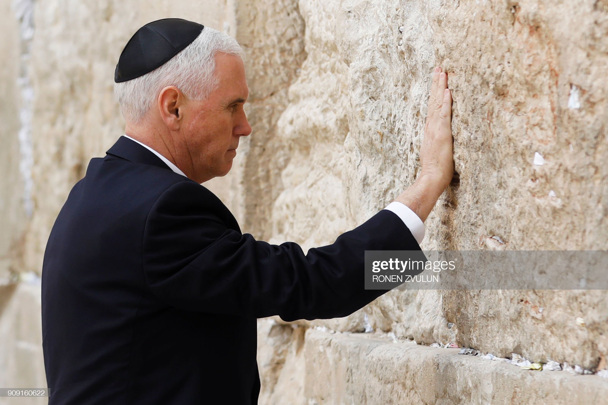 US Vice President Mike Pence touches Jerusalem’s Western Wall during his visit to Judaism’s holiest prayer site on January 23, 2018. Pence proudly reaffirmed US President Donald Trump’s December 6 declaration of Jerusalem as Israel’s capital and pledged to move the embassy to the disputed city by the end of 2019. Pence is following in the footsteps of Trump, who became the first sitting US president to visit the Western Wall in May last year. / AFP PHOTO / POOL / RONEN ZVULUN (Photo credit should read RONEN ZVULUN/AFP via Getty Images)