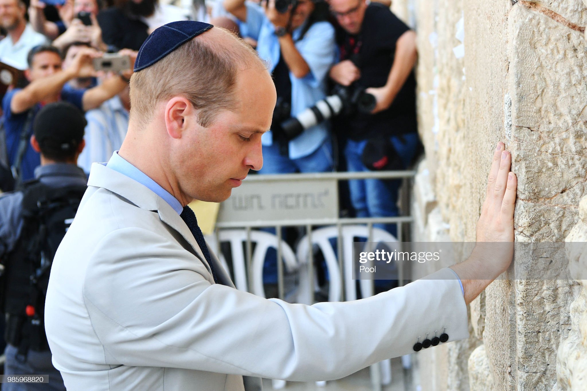 JERUSALEM, ISRAEL – JUNE 28: Prince William, Duke of Cambridge visits the Western Wall, Judaism’s holiest place of prayer, in Jerusalem’s Old City on June 28, 2018 in Jerusalem, Israel. Prince William is on the final day of his official tour of Jordan, Israel and the Occupied Palestinian Territories and is the first member of the British royal family to make an official visit to the Jewish state. (Photo by Tim Rooke-Pool/Getty Images)