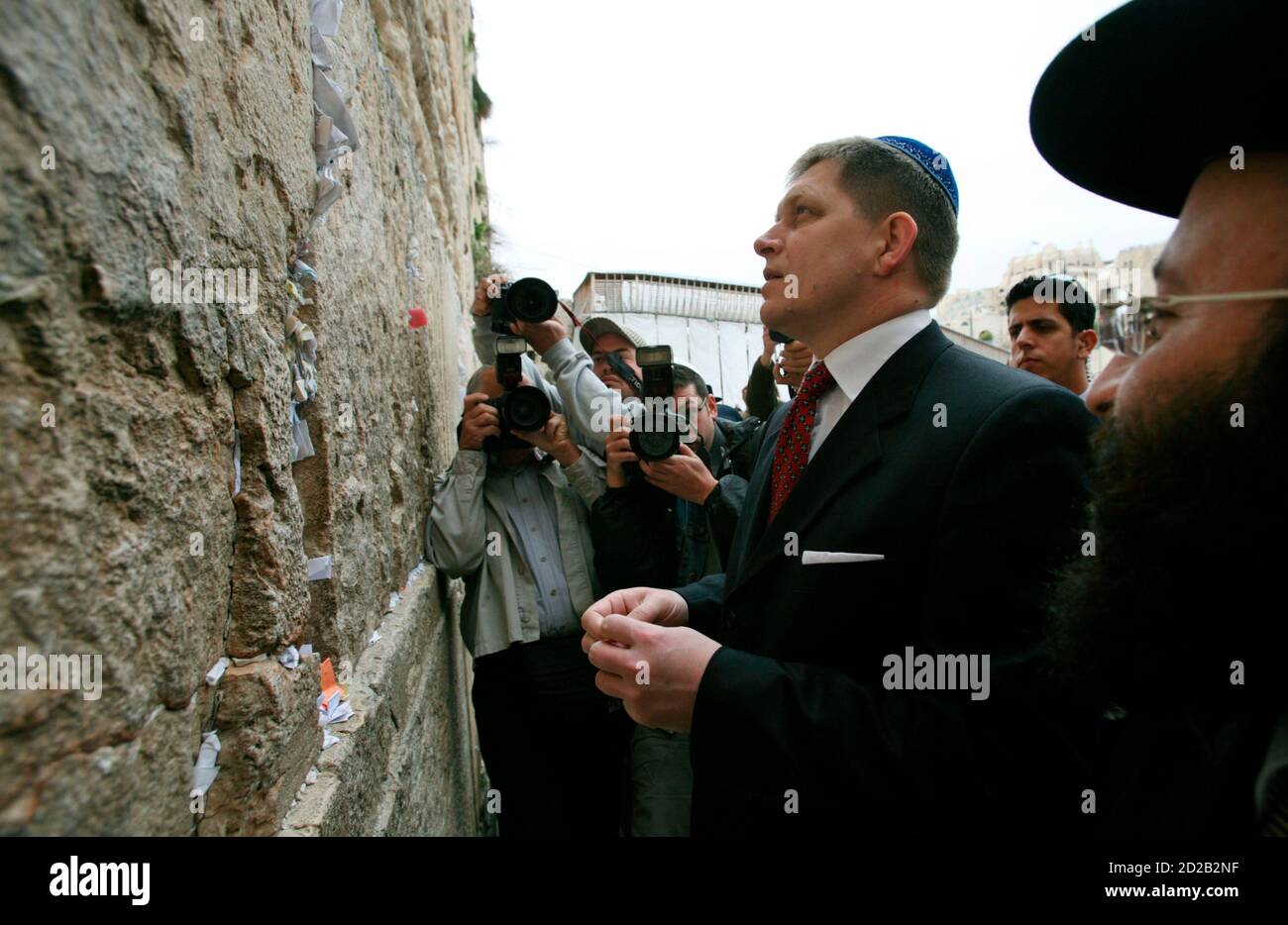 Slovakia’s Prime Minister Robert Fico visits the Western Wall, Judaism’s holiest prayer site, in the Old City of Jerusalem March 20, 2007. REUTERS/Oleg Popov (JERUSALEM)