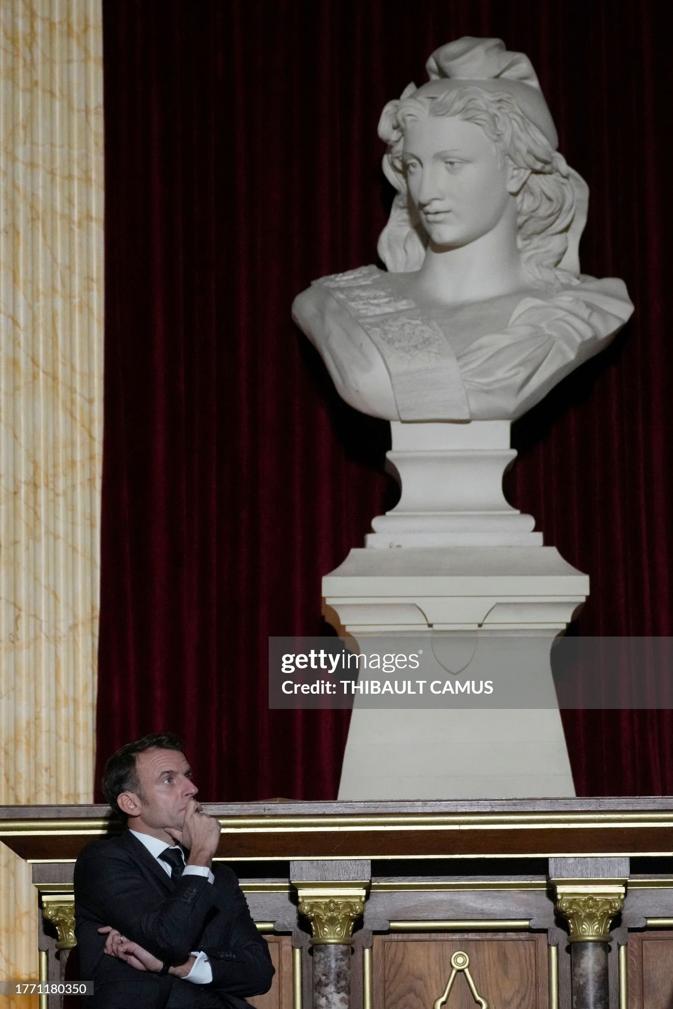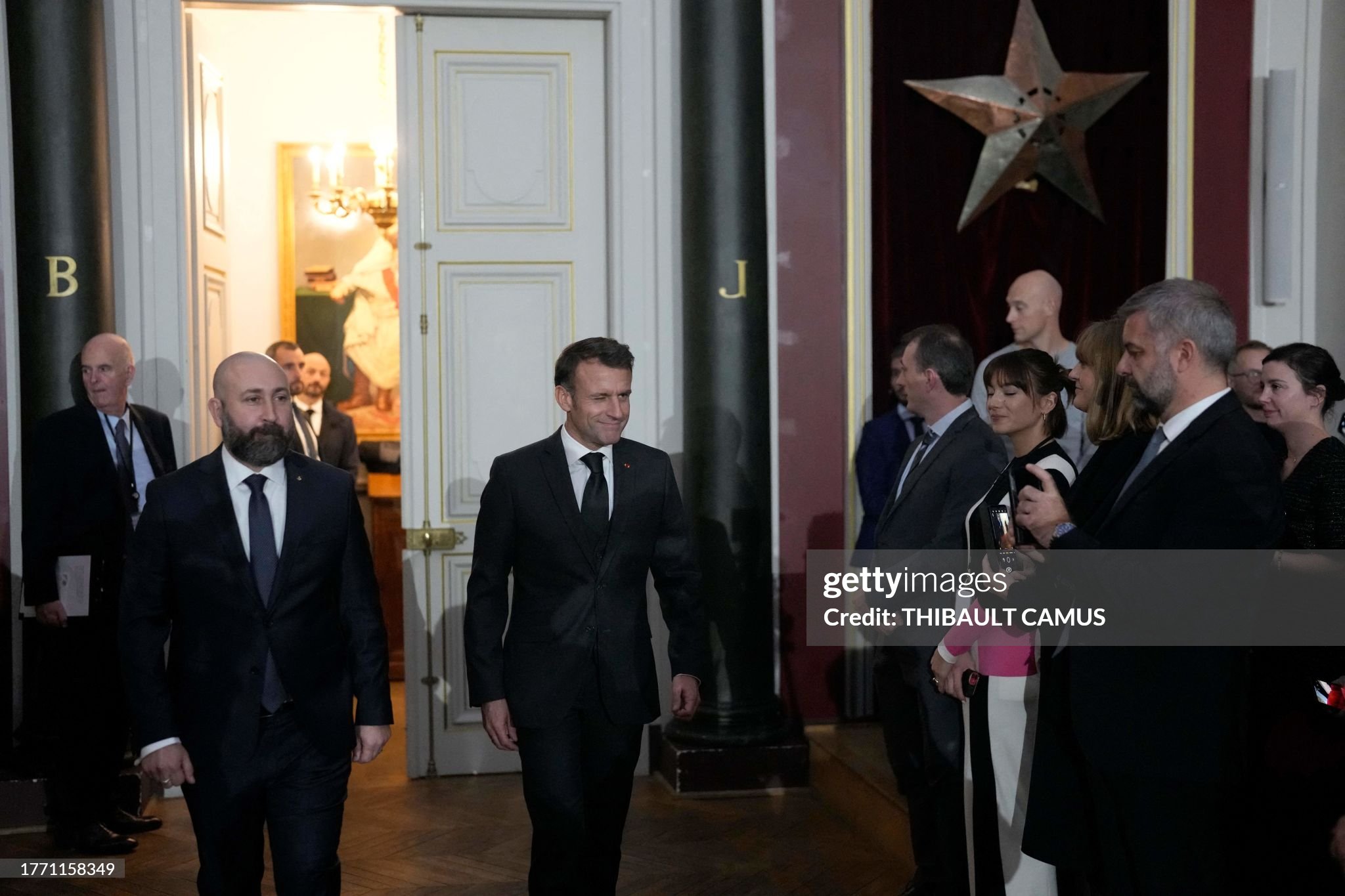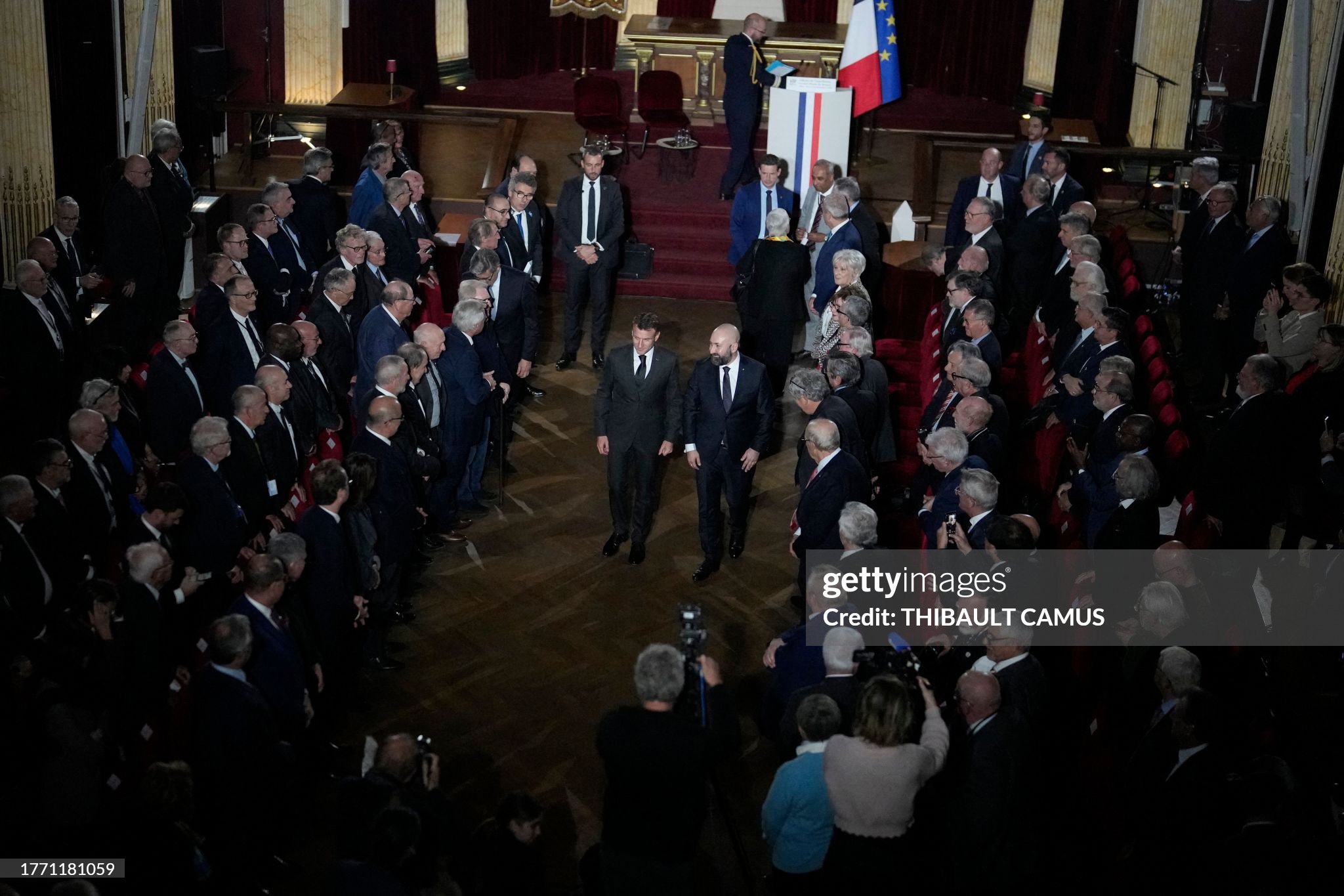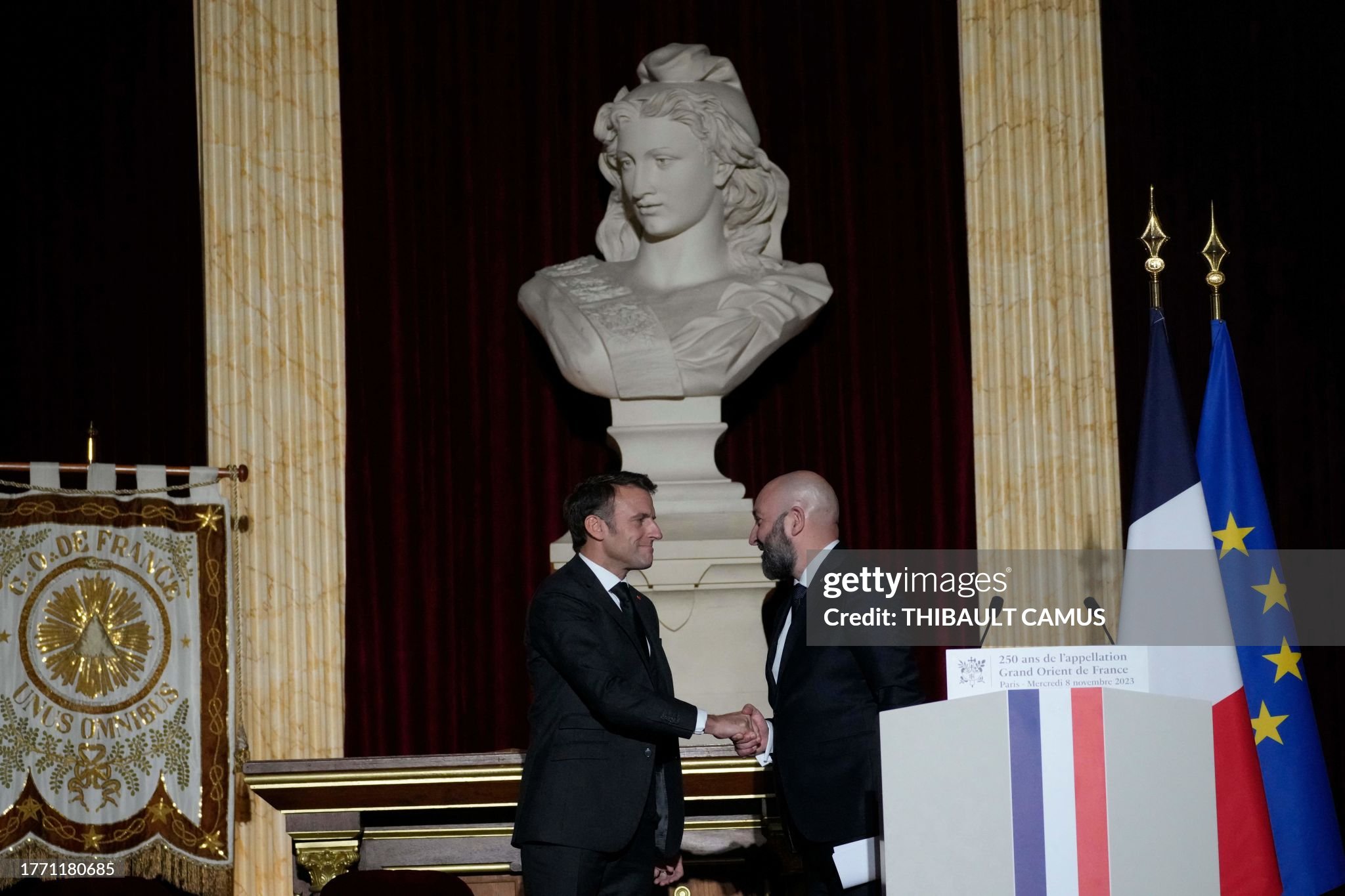 French President Emmanuel Macron (L) shakes hands with Grand Master of the Freemasonic organisation, the Grand Orient de France (GODF) Guillaume Trichard during a meeting with the leaders of France’s Freemason organisations during the 250th anniversary of the Grand Orient of France in Paris, on November 8, 2023. (Photo by THIBAULT CAMUS/POOL/AFP via Getty Images)French President Emmanuel Macron (C-L) and Grand Master of the Freemasonic organisation, the Grand Orient de France (GODF) Guillaume Trichard (C-R) attend a meeting with the leaders of France’s Freemason organisations during the 250th anniversary of the Grand Orient of France in Paris, on November 8, 2023.Macron in an apparent masonic pose.Macron in another apparent winking masonic pose.Grand Master of the Freemasonic organisation, the Grand Orient de France (GODF) Guillaume Trichard speaks during a meeting of French president with the leaders of France’s Freemason organisations during the 250th anniversary of the Grand Orient of France in Paris, on November 8, 2023. (Photo by Thibault Camus / POOL / AFP)Masonic pillars of Boaz and Joachim by Soviet star.