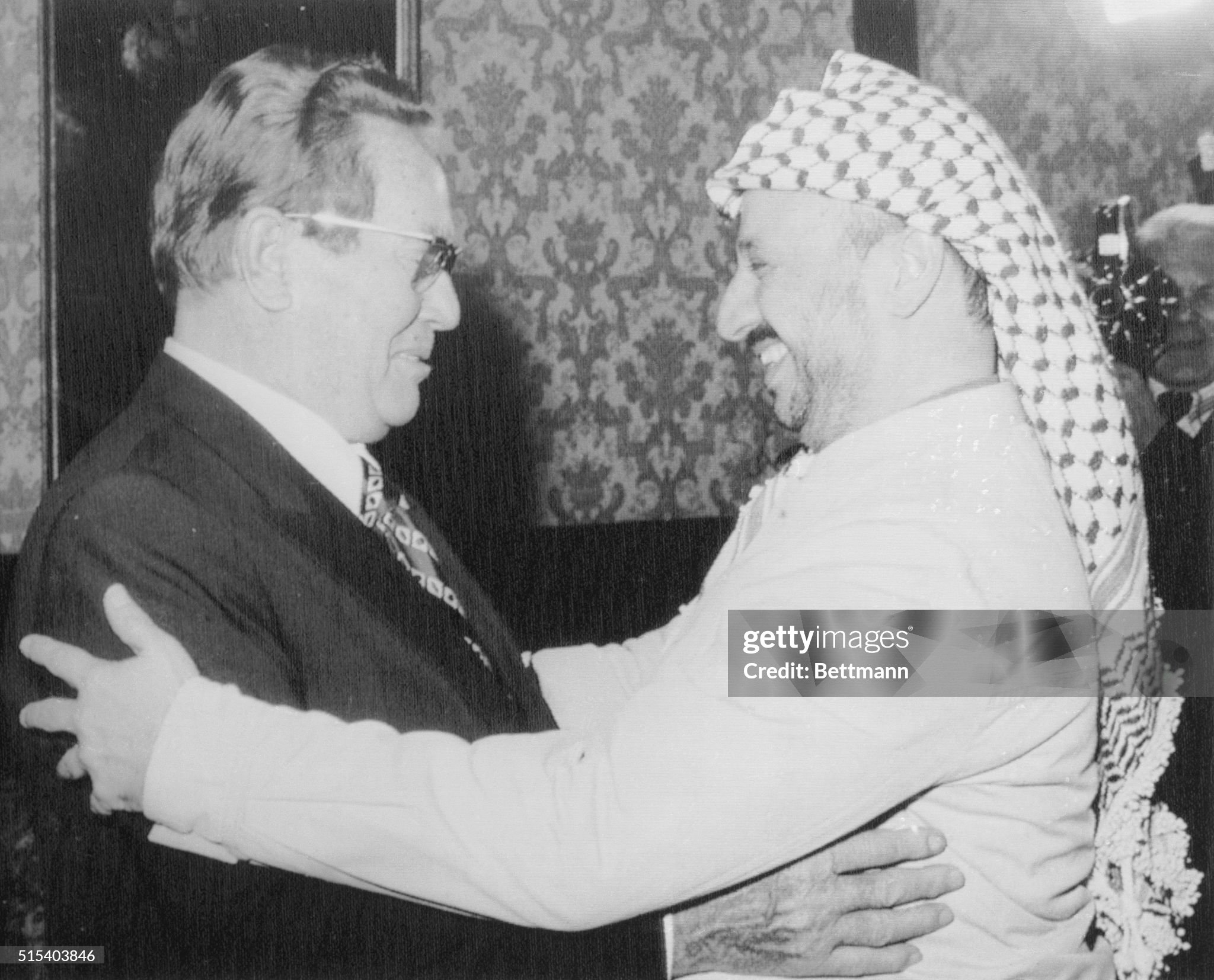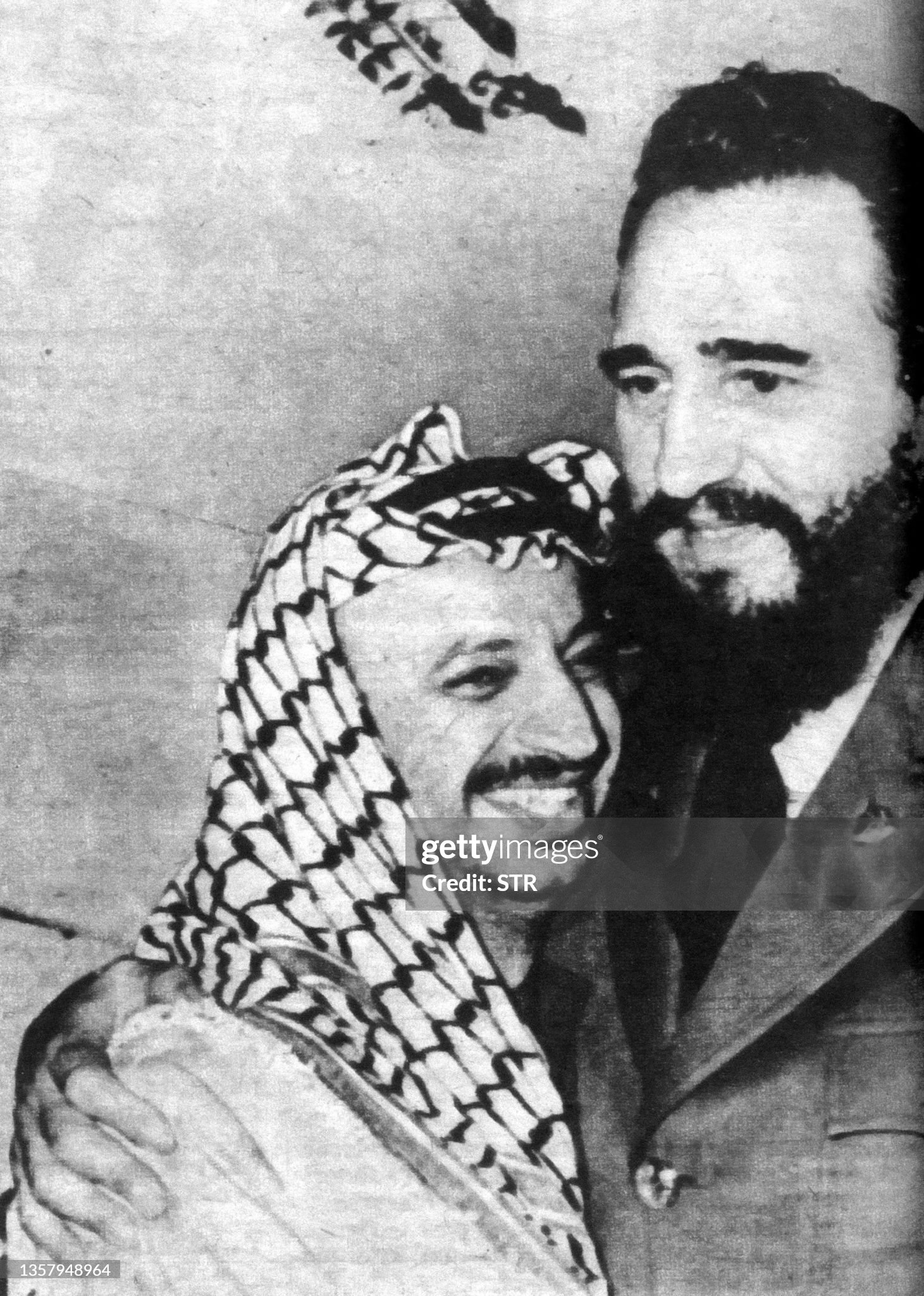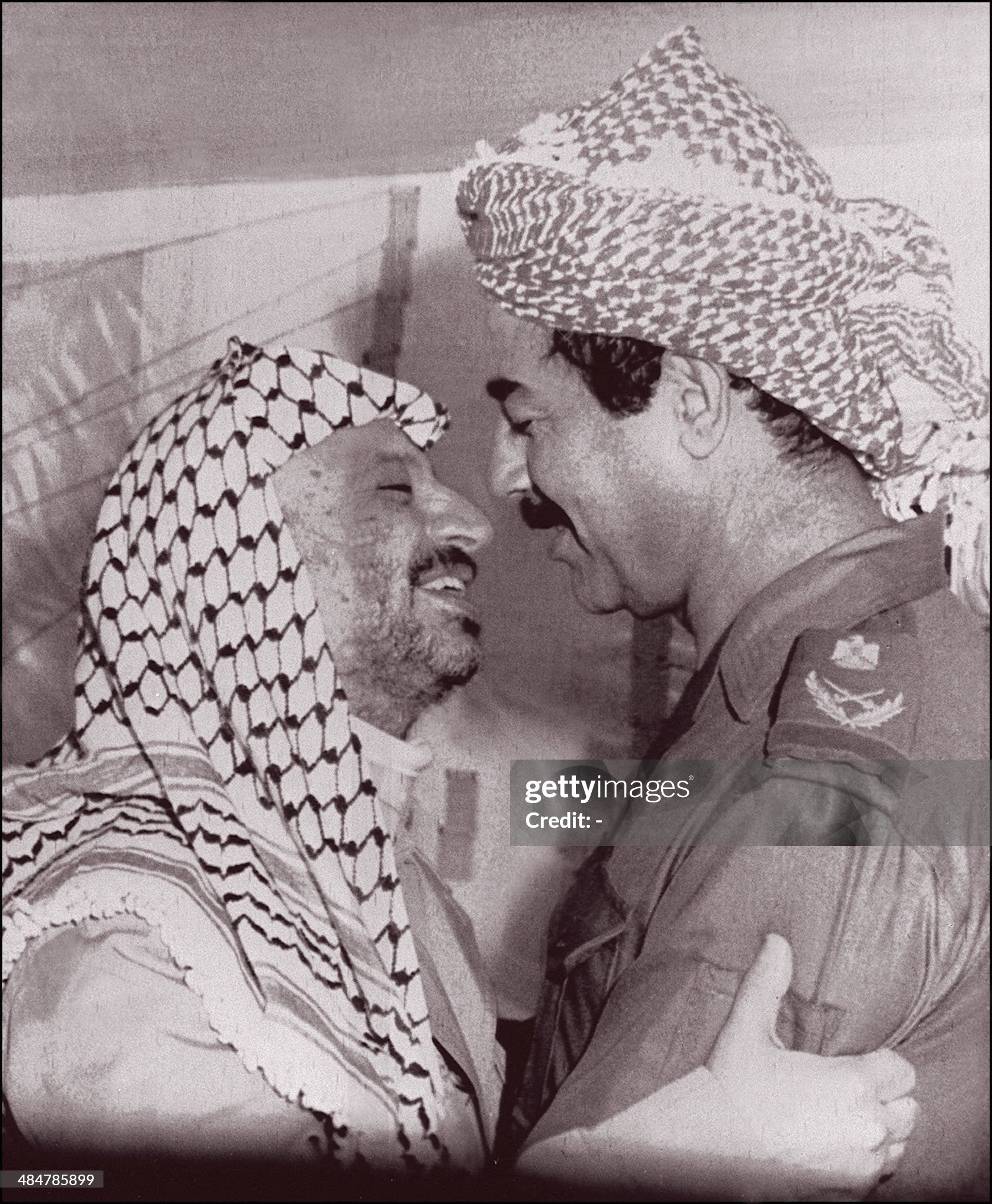 Jabba the Hut’s brother Henry Kissinger, on an official visit in Amman, is offered a traditional Bedoin Keffieh, today worn by the entire Arab population of the Arabic peninsula, Iraq, Jordan, and Syria. It has become the emblem of the Palestinians. (Photo by Claude Salhani/Sygma via Getty Images)Castro and Arafat. Picture taken in November 1974 in Havana of President Fidel Castro (R) and the Palestinian leader Yasser Arafat, during his visit to the island. Castro bade farewell 11 November 2004 to his “endearing friend” Yasser Arafat, calling his passing “a major blow to the progressive movement worldwide.” Arafat, the embodiment of Palestinian aspirations for statehood for four decades, has died at the age of 75, after being critically ill in a Paris hospital since being airlifted from his Ramallah headquarters on October 29. (Photo by STR/AIN/AFP via Getty Images)Communist dictator Josip Broz Tito (left) of Yugoslavia and Palestine Liberation Organization leader Yasser Arafat greet each other, Dec. 4th. Arafat arrived secretly after midnight for an unannounced official visit and talks with Tito on a wide range of issues affecting the future of the Palestinian movement.Iraqi President Saddam Hussein (R) 25 September 1980 in Baghdad kisses Palestine Liberation Organization (PLO) chairman Yasser Arafat. Saddam took the number two job under president Ahamd Hassan al-Bakr, began purging the army of non-Baathist officers, ridding the political scene of Kurds and communists. When Bakr stepped down, officially for health reasons, the stage was set for Saddam, who became president on 16 July 1979. Fearing the impact of Tehran’s Islamic revolution on Iraq’s majority Shiite Muslim population, Saddam launched a war against Iran in 1980 to defend “the eastern flank of the Arab nation from the Persian. But he only managed to obtain a cease-fire in 1988. On 02 August 1990, Saddam directed his army against Kuwait. In February 1991 a multinational coalition led by the United States chased Iraqi troops out of he emirate. (Photo by -/INA/AFP via Getty Images)NABLUS, WEST BANK – JULY 03: Israeli security forces use tear gas as they intervene in the demonstration of Palestinians to protest against construction of Jewish settlements and Israel’s annexation plan of some regions located in West Bank on July 03, 2020 at Qafr Qaddum village in Nablus, West Bank. (Photo by Issam Rimawi/Anadolu Agency via Getty Images)Protesters wearing shirts bearing the logo of the Marxist-Leninist Popular Democratic Party (red) and others wearing bandanas showing the logo of the Shiite movement Hezbollah (yellow) throw stones amidst clashes with security forces during an anti-US demonstration near the United States’ Embassy headquarters in Awkar, northeast of Lebanon’s capital Beirut on July 10, 2020. (Photo by JOSEPH EID / AFP) (Photo by JOSEPH EID/AFP via Getty Images)