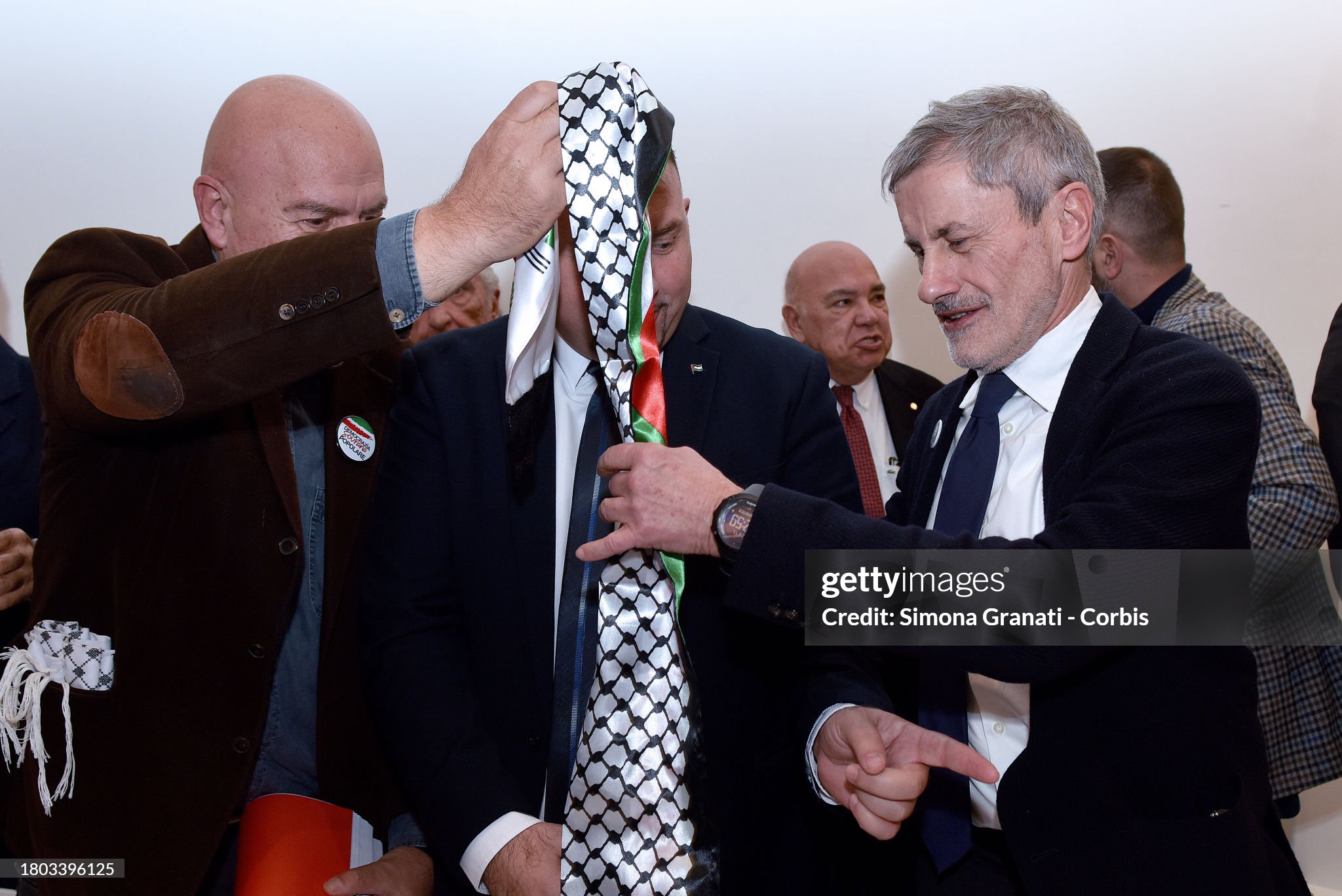 Anti-Zionist Youtuber Brendon O’Connell.Anti-American Kaffiyeh-face-covered protestor holding burning U.S. flag torched by crowd during gulf crisis pro-Iraqi, anti-US rally organized by Muslim Brotherhood. (Photo by Barry Iverson/Getty Images)Artist Scott Tyler, sporting kaffiyeh & Mao t-shirt, among activists protesting constitutional amendment banning flag desecration, outside Capitol. (Photo by Cynthia Johnson/Getty Images)Irish actor Colin Farrell.A Palestinian man carries his son on his shoulders, with a US-made M-16 rifle in his hands, during a march in the streets of the Ain al-Helweh refugee camp in the outskirts of the southern Lebanese port of Sidon, following the Friday prayers, 13 October 2000. In the demonstration, thousands of Palestinians asked to join the uprising in the Palestinian territories against Israel and denounced the U.S. backing to the Jewish state’s “savageness”. (Photo by MAHMOUD ZAYYAT/AFP via Getty Images)Anti-globalisation demonstrators (except if it’s Communists doing the globalizing) take to the streets of Brussels 15 December 2001, on the second day of the European Union summit in Laeken. AFP PHOTO BELGA/ HERWIG VERGULTGreek Patriarch of Jerusalem Irineos I (R) sits next to the empty chair of Palestinia leader Yasser Arafat during the Orthodox Christmas mass inside the Church of Nativity, believed to be the birth place of Jesus Christ, in the West Bank town of Bethlehem 06 January 2002. Palestinian leader Yasser Arafat was set to miss a second round of Christmas services as he remained trapped in Ramallah by the Israeli army. (Photo by MUSA AL SHAER/AFP via Getty Images)A masked Palestinian militant with the Al-Aqsa Martyrs Brigades, a radical offshoot of Palestinian leader Yasser Arafat’s Fatah faction, holds up his gun during a military parade 29 March 2002 in the Shatti refugee camp in Gaza City in the Gaza Strip. Arab and European states sharply criticized Israel and mounted a global diplomatic effort to pressure the Jewish state to call off its all-out military drive against the Palestinian leadership. (Photo by MOHAMMED SABER/AFP via Getty Images)A woman places a keffiyeh on Pope Benedict XVI. See article The Pope dons a keffiyeh.ROME, ITALY—Marco Rizzo, former secretary of the Italian Communist Party, Gianni Alemanno secretary of the new political entity “Independenza”, mayor of Bethlehem, Hanna Hanania , pose with the Palestinian scarfin at the end of the round table against the war in Gaza, to defend the rights of all peoples, during the assembly of the movement “Indipendenza”,at MIDAS Palace Hotel,on November 26, 2023 in Rome, Italy. (Photo by Simona Granati – Corbis/Corbis via Getty Images)OPERATION SIG ALERT! Wearing gas masks and holding a placard of the “Star and Strips” with a Nazi Swastika replacing the Stars, Lebanese demonstrate outside the US embassy in Awkar just northeast of Beirut 21 March 2003. Others protested outside the Qatari embassy and also in the Ain el-Helweh Palestinian refugee camp in southern Lebanon. People took to the streets following Friday prayers throughout the Arab and Muslim world. In the background is the Iraqi flag. (Photo by HAITHAM MUSSAWI/AFP via Getty Images)A supporter has his picture taken with Toronto Mayor Rob Ford in a keffiyeh which he presented him at the kick-off of Ford’s re-election campaign in Toronto on April 17, 2014. Ford, who made worldwide headlines last year after admitting binge drinking and smoking crack, has been stripped of most of his powers. GEOFF ROBINS/AFP via Getty Images)